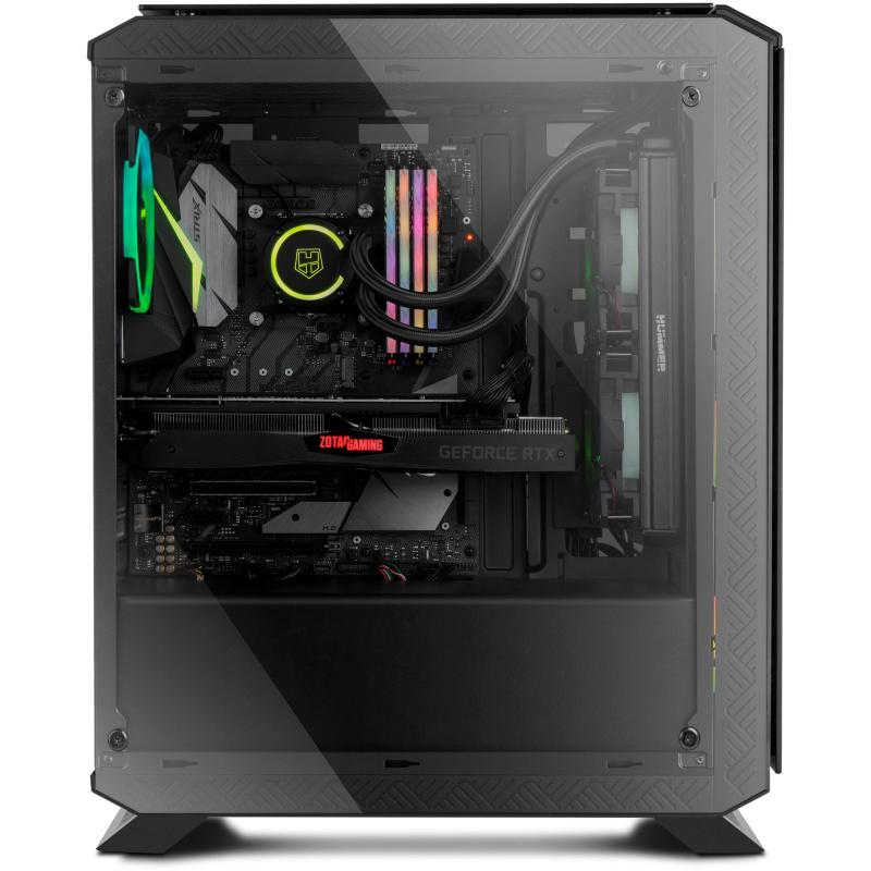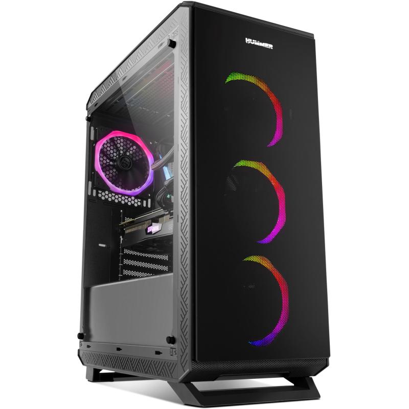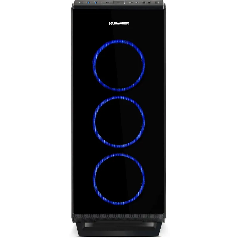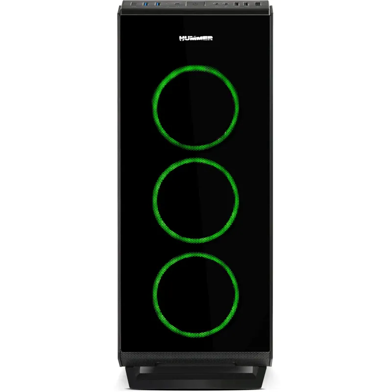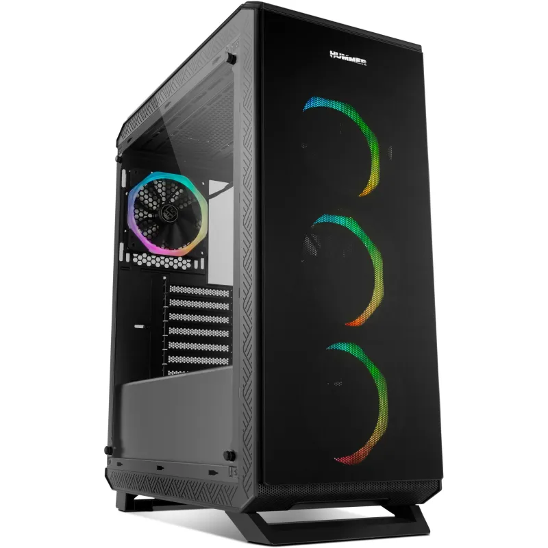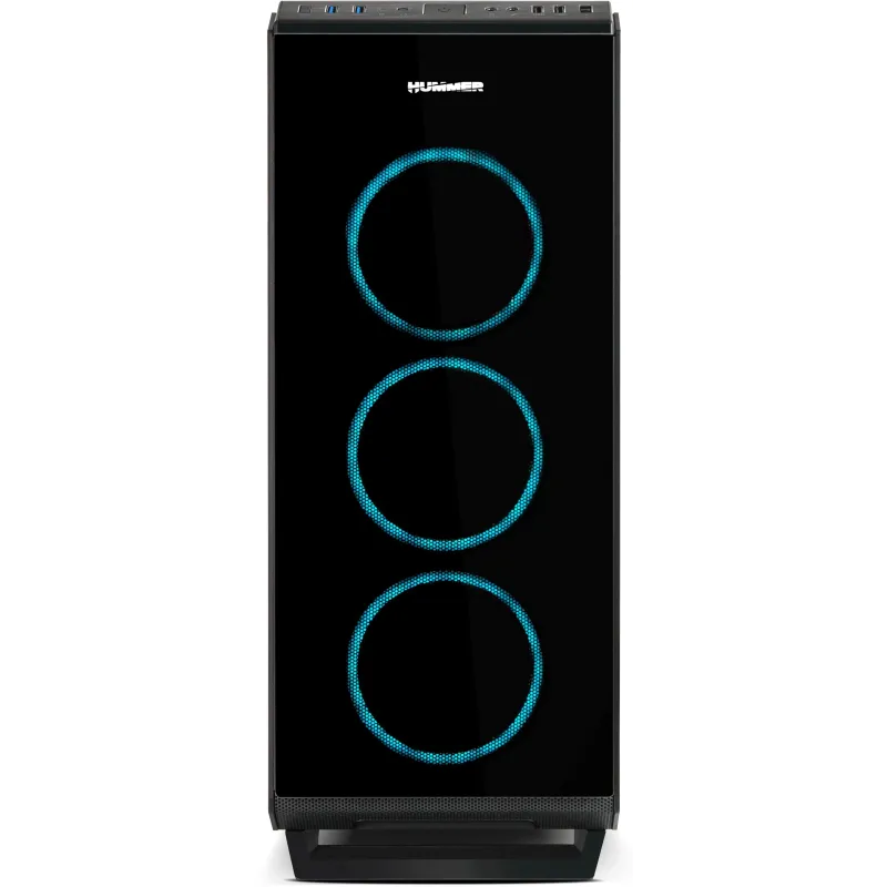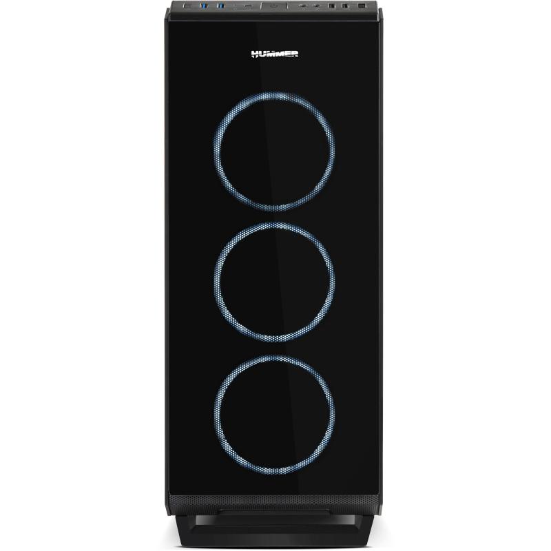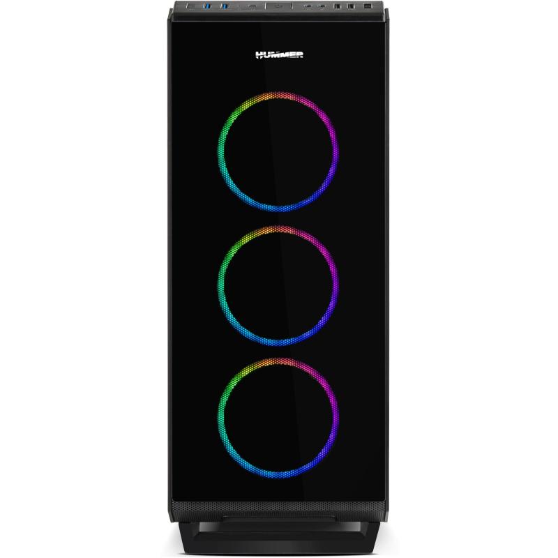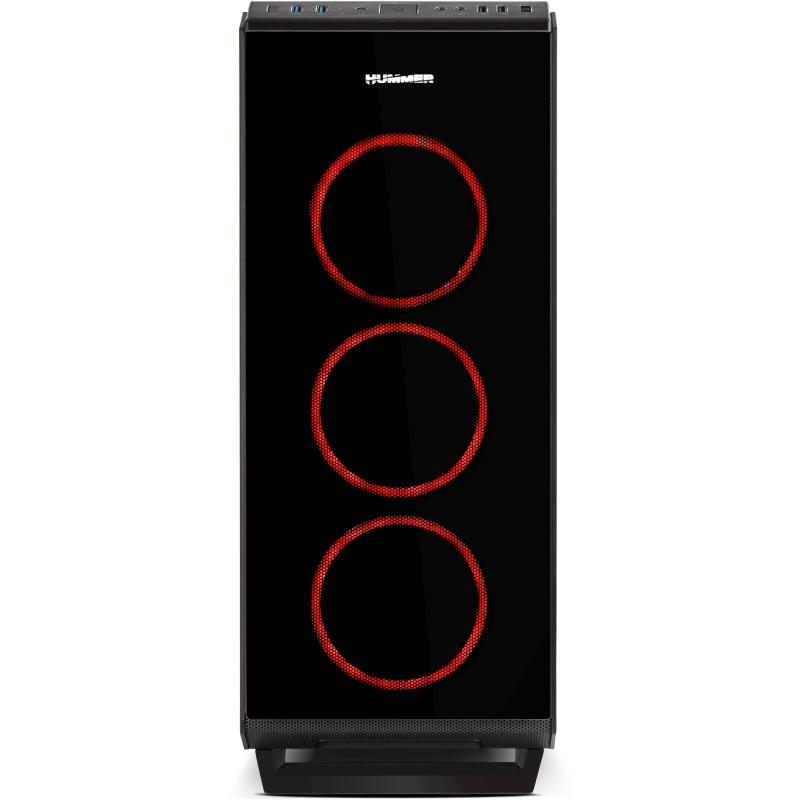 ILUMINACIÓN ARGB CHASIS DE VIDRIO TEMPLADO COMPLETO: Hummer TGF es un robusto chasis con excelentes acabados y prestaciones para integrar prácticamente cualquier tipo de configuración gracias a sus generosas dimensiones y su gran sistema de refrigeración. Ha sido diseñada con 4 paneles en cristal templado, los dos paneles laterales, frontal y superior, lo que le proporciona un acabado sobrio y además permite hacer infinitas configuraciones en su interior disfrutando de la iluminación de los componentes.