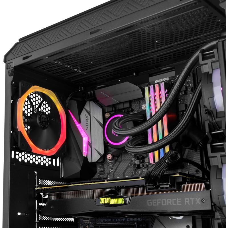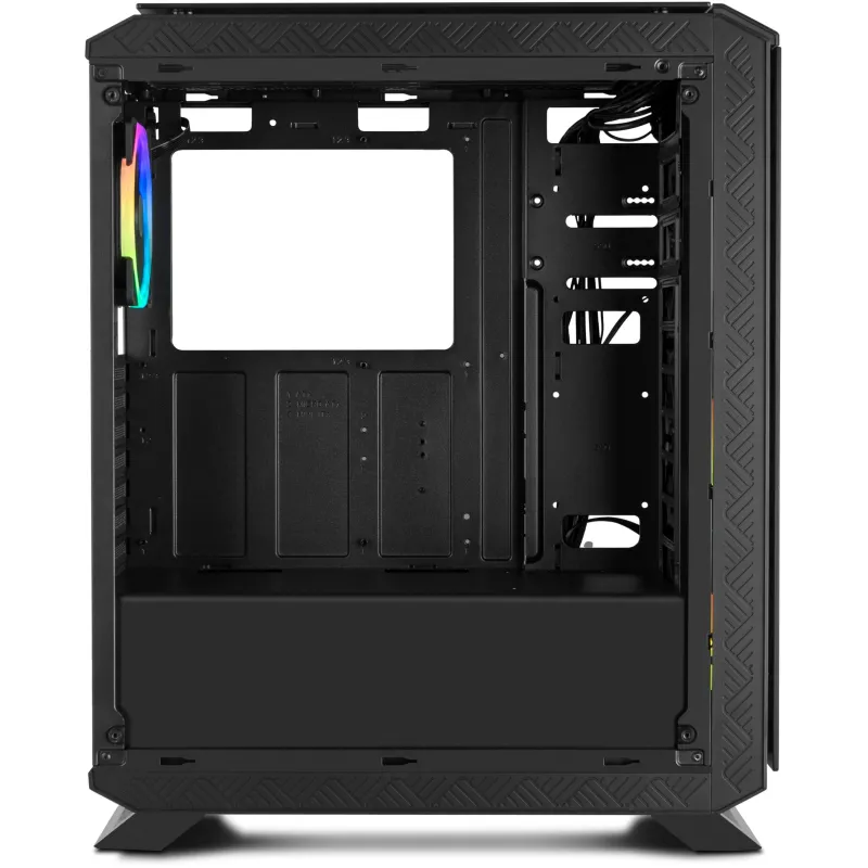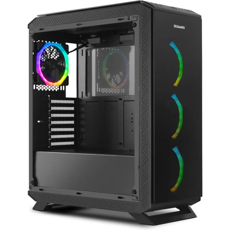 SISTEMA DE VENTILACIÓN: Para refrigerar de manera eficiente todos los componentes de nuestra configuración, Hummer TGF cuenta con capacidad para instalar hasta seis ventiladores. En su panel frontal incluye tres ventiladores de 120 mm con ARGB Rainbow, uno en su panel trasero también de 120 mm con ARGB Rainbow pero además es posible instalar dos ventiladores más de 120 mm o 240 mm en su panel superior. Además, cuenta con rejillas en su frontal que permitirán que el aire frío entre en el interior del PC que se expulse por sus rejillas superiores.