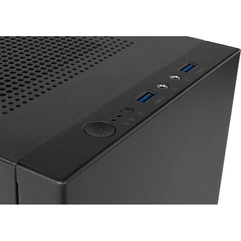 Aunque la fuente de alimentación no está incluida, este chasis está preparado para una excelente gestión de cables y componentes. En términos de conectividad, cuenta con 2 puertos USB 3.2 Gen 1 tipo A, y entradas/salidas de audio, facilitando el acceso y uso de periféricos.