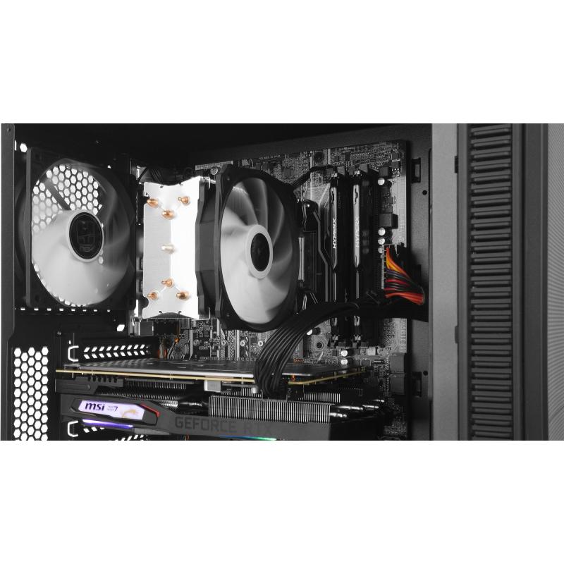 El sistema de enfriamiento incluye dos ventiladores frontales de 120 mm preinstalados, con soporte para hasta tres ventiladores frontales de 120 o 140 mm, y un ventilador trasero de 120 mm, asegurando una óptima circulación de aire y disipación de calor. Además, cuenta con gestión de cables, facilitando una instalación limpia y organizada.