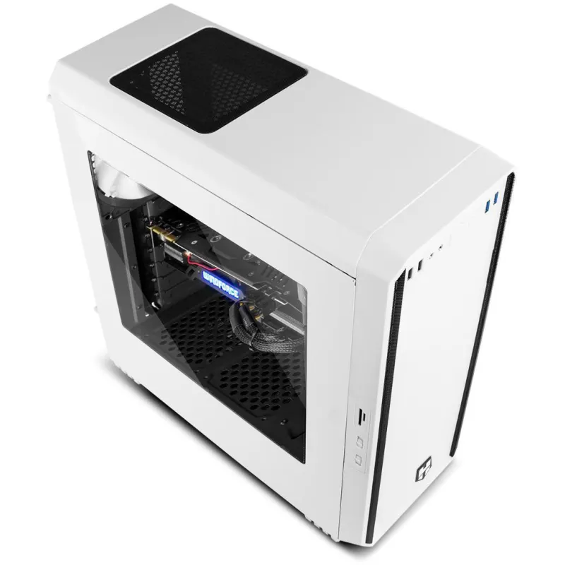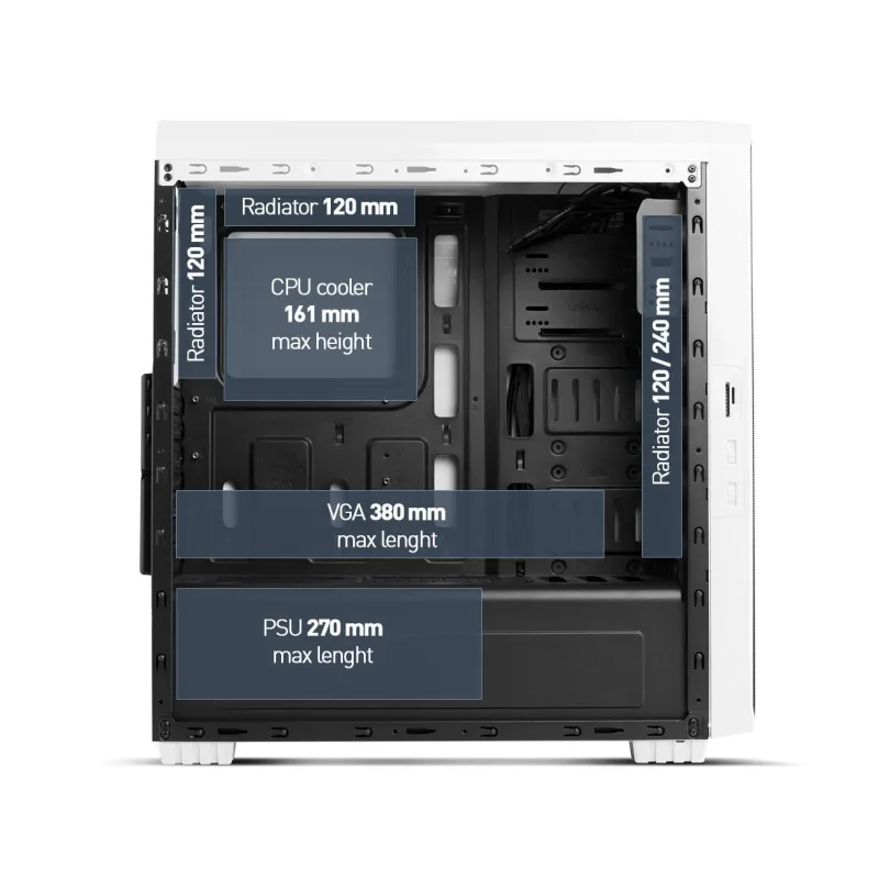 DISEÑO INNOVADOR: Confeccionado con materiales de alta calidad como ABS sintéticos y SPCC, este elegante dispositivo en color blanco redefine la estética y funcionalidad de los equipos de sobremesa. Su factor de forma Midi Tower y compatibilidad con tarjetas madre ATX y micro ATX proporcionan una flexibilidad que se adapta a diversas configuraciones. La ventana lateral no solo permite una vista interna del sistema, sino que también añade un toque de sofisticación. Las dimensiones están optimizadas para asegurar la máxima eficiencia de espacio sin comprometer el rendimiento, con una altura máxima para la CPU de 16,1 cm y una longitud máxima para la tarjeta de gráficos de 38 cm.