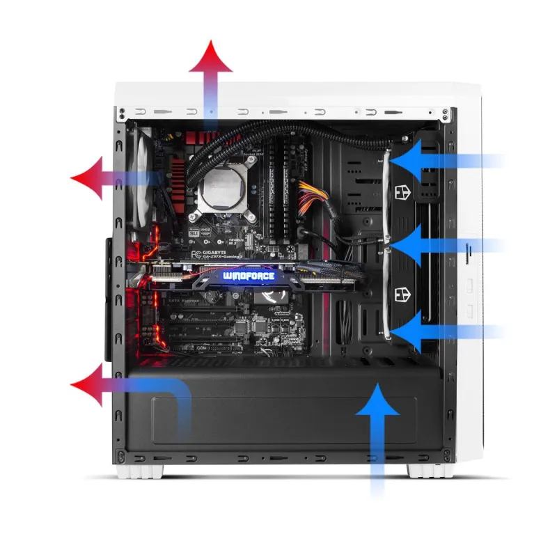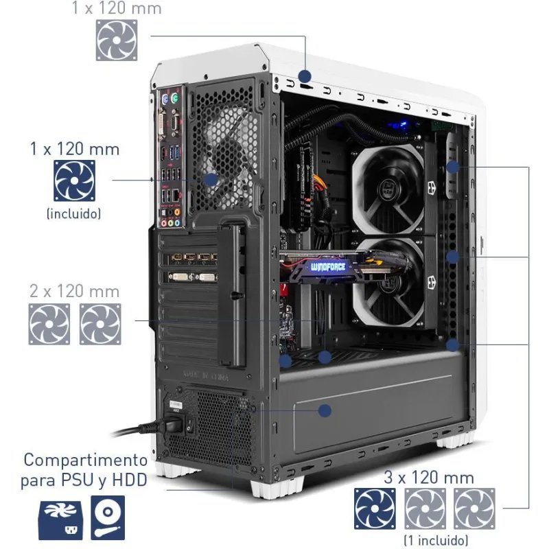 SISTEMA DE VENTILACIÓN: Hummer ZS Zero cuenta con un excelente sistema de ventilación, que garantiza un eficaz flujo de aire en el interior del equipo. En su interior cuenta con dos ventiladores de 120 mm preinstalados, uno en la parte frontal y uno en la parte posterior. Adicionalmente, ofrece la posibilidad de instalar tres ventiladores más de 120 mm; dos en el frontal y uno en la parte superior.