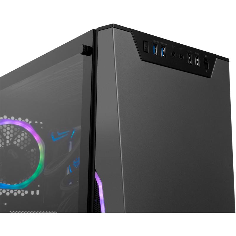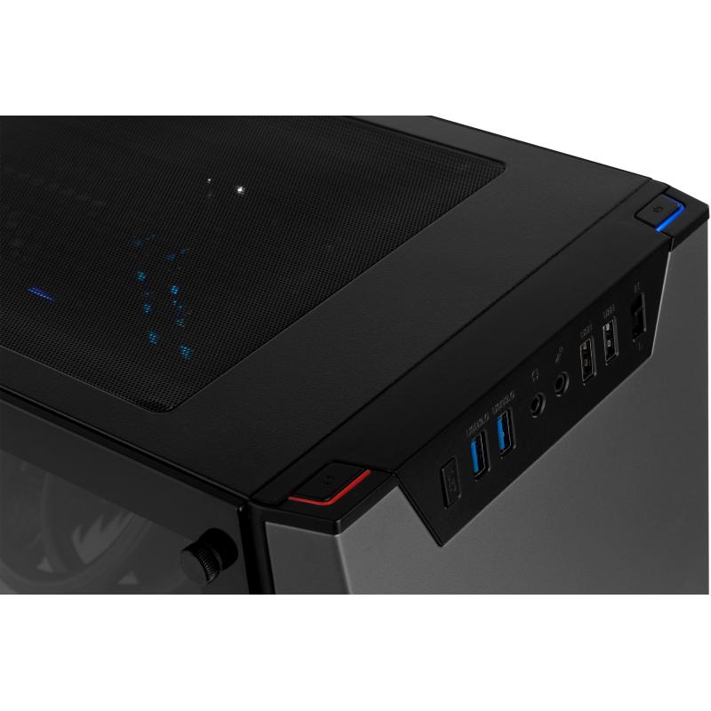 DISEÑO CON CRISTAL TEMPLADO: El frontal de Infinity Sigma incorpora dos puertos USB 2.0, dos puertos USB 3.0, las conexiones de audio, un botón para controlar el ARGB del panel frontal y otro para controlar la velocidad de los ventiladores.