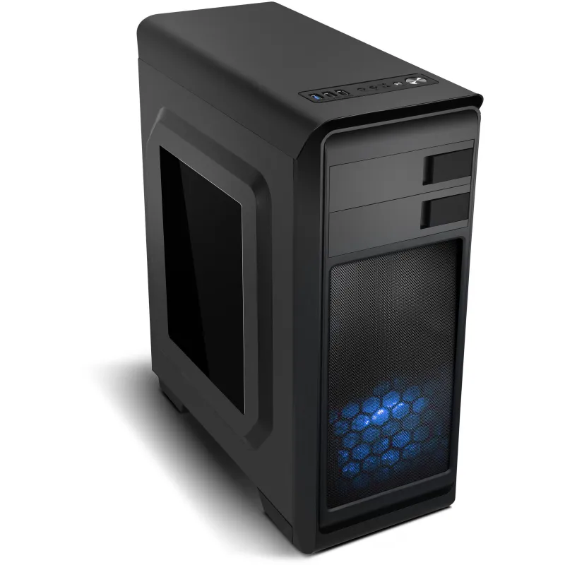 DISEÑO SOFISTICADO Y FUNCIONAL: Confeccionado en resistente SPCC, este chasis se presenta en un elegante negro que se adapta a cualquier ambiente profesional o de entretenimiento. Su estructura tipo Midi Tower es ideal para quienes buscan un equilibrio entre espacio y versatilidad, compatible con tarjetas madre ATX y micro ATX. Las múltiples bahías y puertos internos y externos, incluyendo dos de 3.5", dos de 5.25" y una de 2.5", permiten una personalización y expansión sin precedentes. Además, la ventana lateral y la iluminación frontal azul aportan un toque de distinción y modernidad.