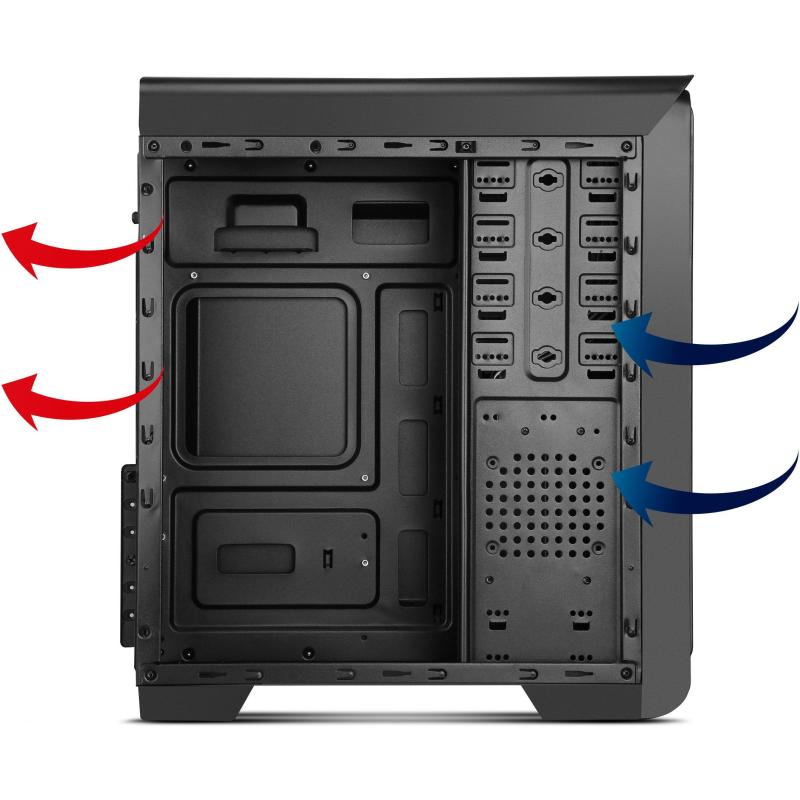 El sistema de enfriamiento viene con 1 ventilador frontal de 120 mm preinstalado y soporta 1 ventilador trasero de 80 mm, asegurando un flujo de aire eficiente para mantener los componentes a temperaturas óptimas. Adicionalmente, el chasis tiene capacidad de refrigeración adicional para mejorar el rendimiento.