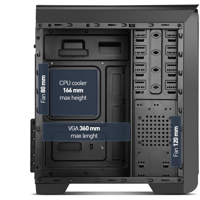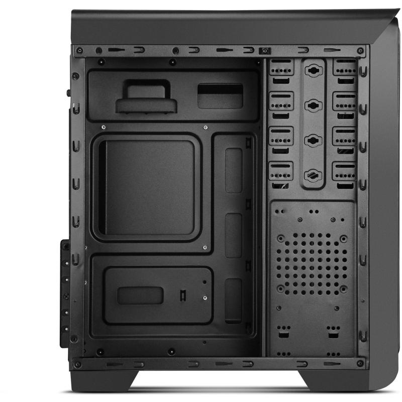 Cuenta con 2 bahías externas de 5.25’’ y 3 bahías internas, dos de 3.5’’ y una de 2.5’’, así como 7 slots de expansión. Además, permite instalar una fuente de alimentación estándar ATX.