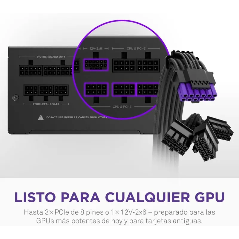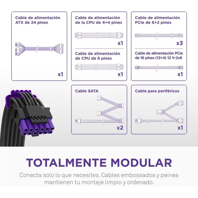 Contenido del embalaje - Cables incluidos: Corriente alterna, CPU, PCIe, Peripheral (Molex), SATA