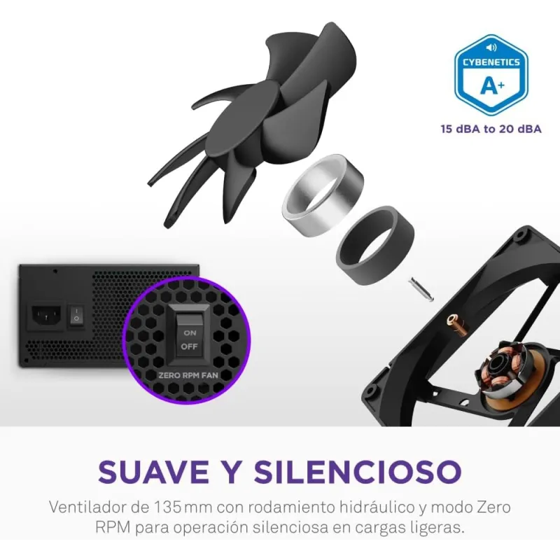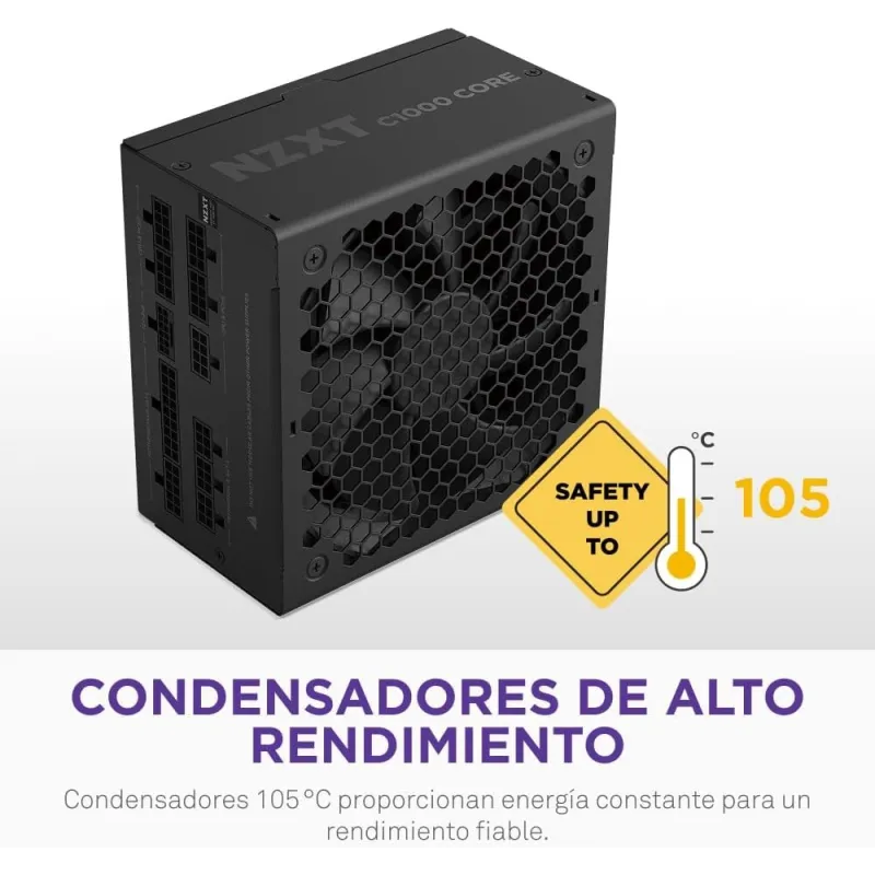 Equipada con un ventilador de 13,5 cm y tecnología de rodamientos FDB, la Fuente de Alimentación NZXT C1000 Gold Core Negra ofrece un sistema de refrigeración silencioso y eficaz. Su velocidad ajustable entre 0 y 2300 RPM permite mantener una temperatura óptima sin generar ruidos excesivos, incluso bajo carga. Este sistema de enfriamiento activo prolonga la vida útil de los componentes internos, garantizando un rendimiento constante a lo largo del tiempo. Además, la fuente está diseñada para soportar temperaturas de operación de hasta 50 °C, lo que demuestra su robustez y fiabilidad. La combinación de ventilación eficiente, certificación 80 PLUS Gold y potencia de 1000 W hace que esta fuente sea ideal para entornos exigentes y de alto rendimiento.