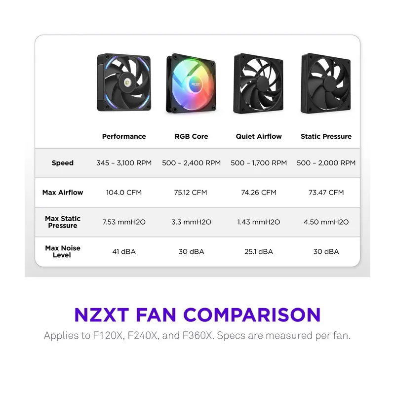 Ventilador NZXT F240X RGB Negro con flujo de aire 104 cfm, velocidad de 3100 RPM y rodamiento FDB, ofrece rendimiento silencioso y eficiente