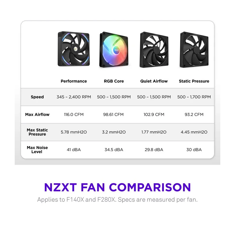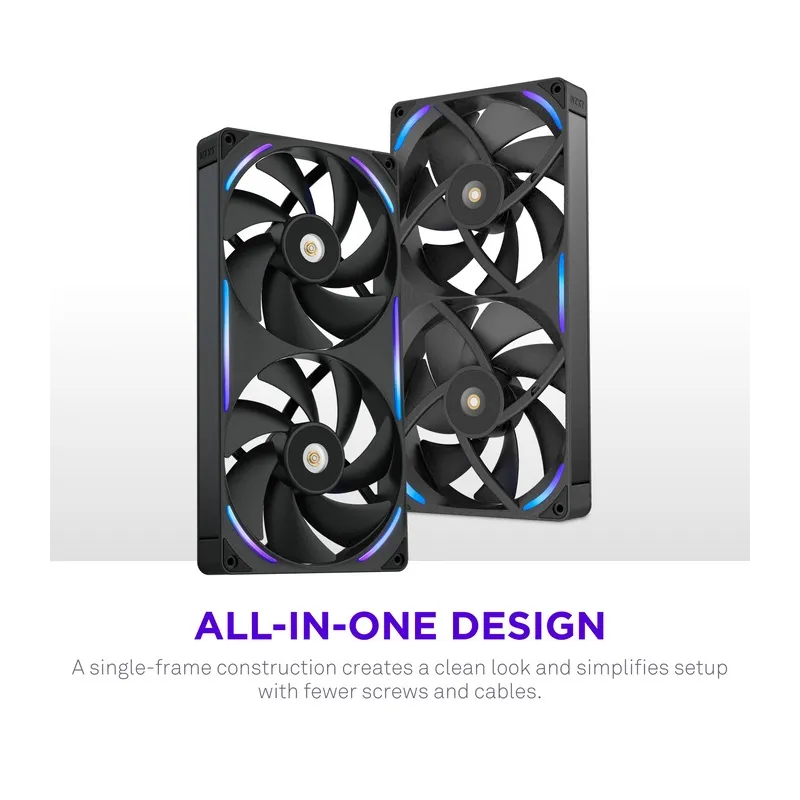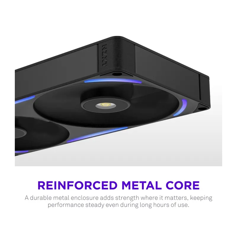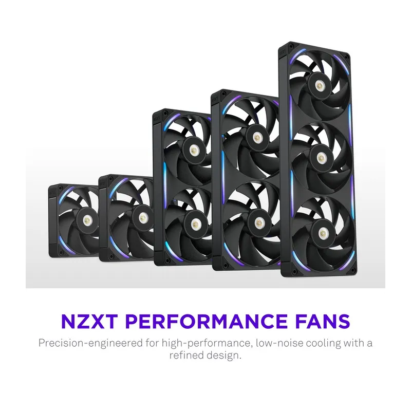 Ventilador NZXT F280X RGB Negro de 280mm con flujo de aire 116 cfm, velocidad del ventilador 2400 RPM, rodamiento FDB y 24 LED multicolor para carcasa