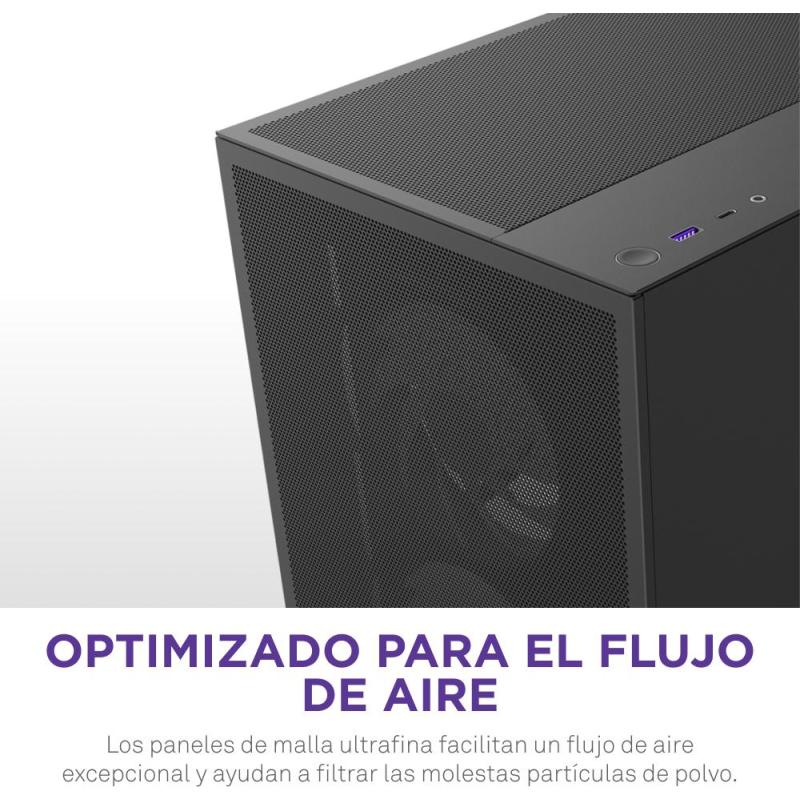 DISEÑO OPTIMIZADO PARA EL FLUJO DE AIRE: La NZXT H5 Flow RGB en su versión black (negra) es una caja e-ATX de torre media compacta, diseñada para ofrecer un flujo de aire óptimo y una excelente refrigeración para la GPU. Su diseño incluye un recubrimiento de PSU perforado y paneles de malla ultrafina en la parte superior, frontal y lateral, lo que maximiza el flujo de aire mientras filtra el polvo.