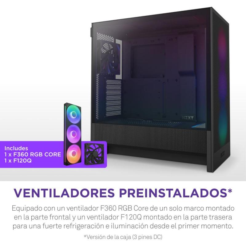 REFRIGERACIÓN EFICIENTE CON VENTILADORES 120 MM: Equipada con un potente sistema de ventilación, la torre NZXT H5 Flow RGB 2024 incluye ventiladores 120 mm preinstalados en la parte frontal y trasera. Estos garantizan un flujo de aire constante, manteniendo los componentes a temperaturas óptimas incluso en sesiones de juego exigentes. Además, su compatibilidad con refrigeración líquida permite la instalación de radiadores de hasta 360 mm en la parte frontal, asegurando un rendimiento térmico excepcional.