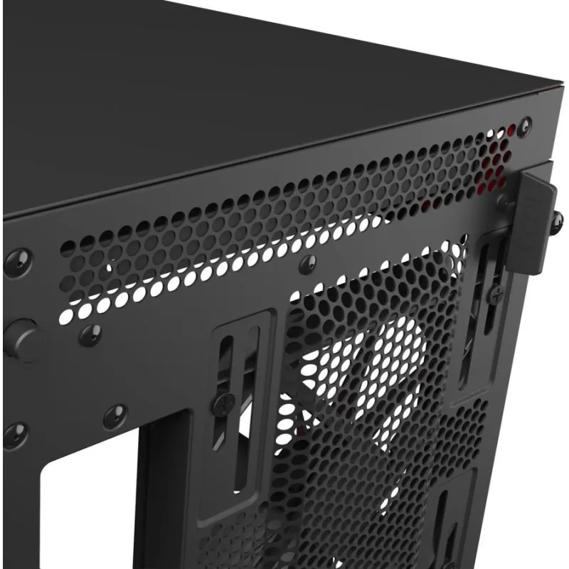 Cuenta con 4 puertos de 3.5" y 7 bahías de 2.5", además de 7 ranuras de expansión, lo que permite una amplia capacidad de almacenamiento y expansión. La ventana lateral y los paneles de vidrio templado no solo mejoran la estética, sino que también permiten una vista clara del interior del sistema. Además, incluye un filtro anti-polvo y una excelente gestión de cables para mantener el sistema limpio y ordenado. El botón de encendido/apagado está convenientemente ubicado.