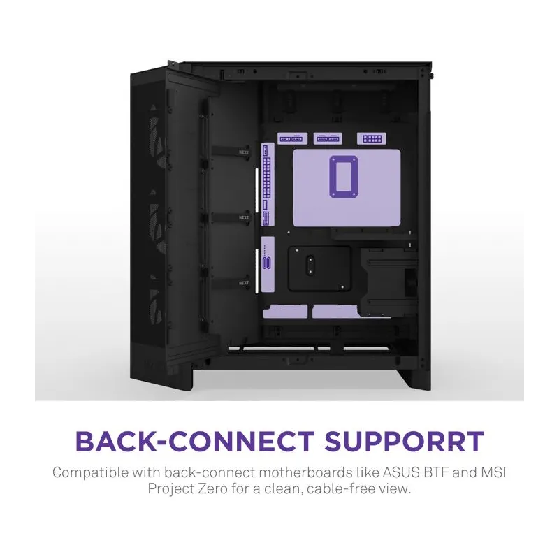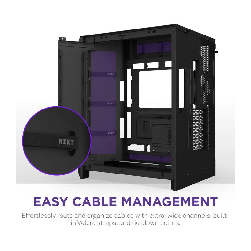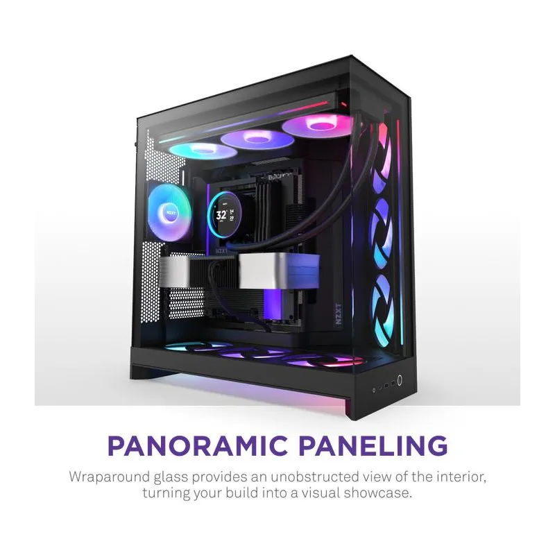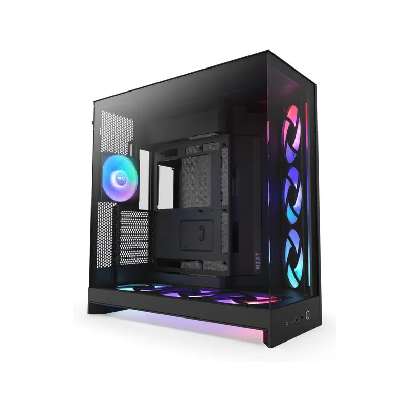 La Torre NZXT H9 Flow RGB+ BK ofrece un diseño moderno y funcional que destaca por su estructura en vidrio templado y materiales de alta calidad como malla y SGCC. Esta torre de formato Midi Tower es compatible con placas base ATX, EATX, micro ATX y Mini-ITX, lo que la convierte en una opción versátil para configuraciones avanzadas. Su diseño incluye una ventana lateral que permite exhibir los componentes internos con iluminación RGB multicolor integrada en los ventiladores. Además, cuenta con una excelente gestión de cables y espacio suficiente para tarjetas gráficas de hasta 45,9 cm y disipadores de CPU de hasta 16,5 cm de altura. La inclusión de múltiples ranuras de expansión y bahías para discos duros y SSDs facilita una configuración potente y personalizable.