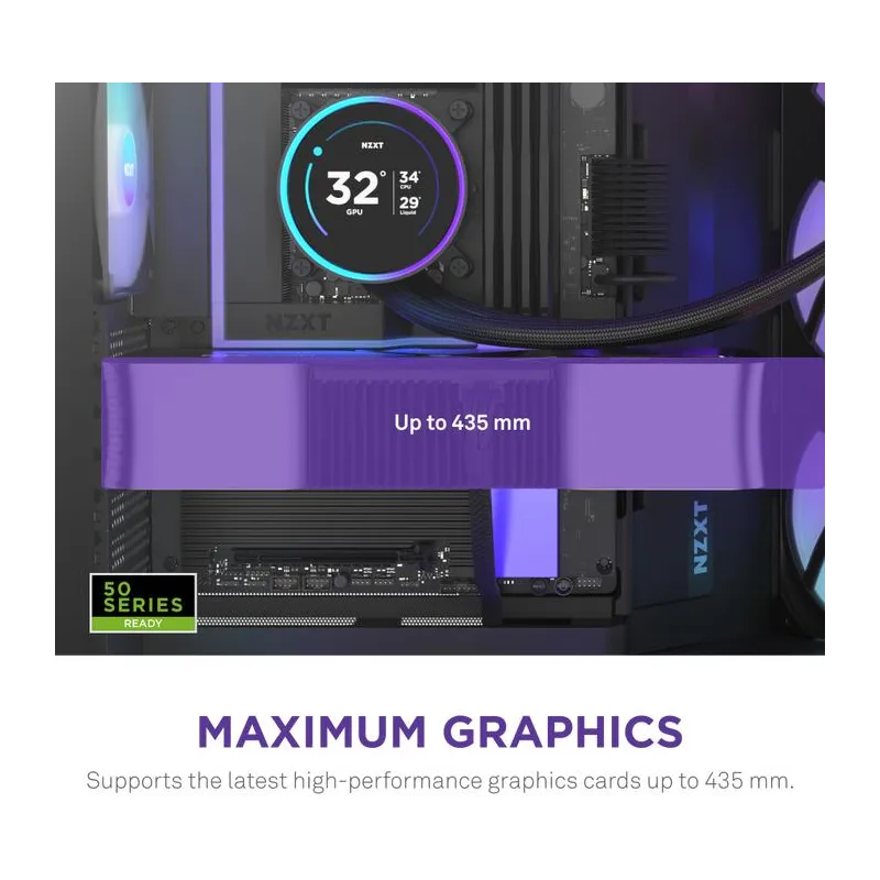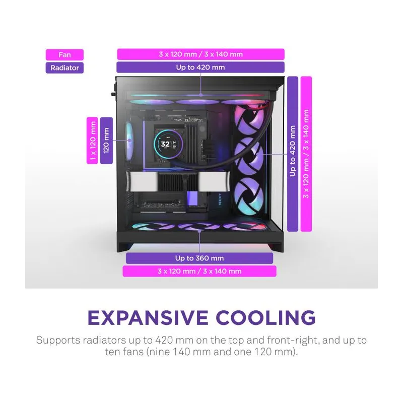 REFRIGERACIÓN EXTREMA CON RADIADOR 420 MM: La Torre NZXT H9 Flow RGB+ BK está diseñada para entusiastas que buscan el máximo rendimiento térmico. Su compatibilidad con radiador 420 mm en la parte frontal y superior permite instalar configuraciones de refrigeración líquida avanzadas, garantizando un flujo de aire óptimo incluso en condiciones de uso intensivo. Además, admite hasta nueve ventiladores distribuidos en todas las caras de la torre, lo que asegura una ventilación constante y efectiva. Esta capacidad de refrigeración convierte a la Torre NZXT H9 Flow RGB+ BK en la elección perfecta para equipos de alto rendimiento, manteniendo temperaturas estables y prolongando la vida útil de los componentes. Su diseño interno facilita la instalación de sistemas de refrigeración complejos sin comprometer el espacio ni la estética.