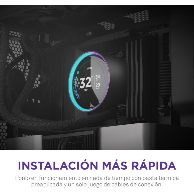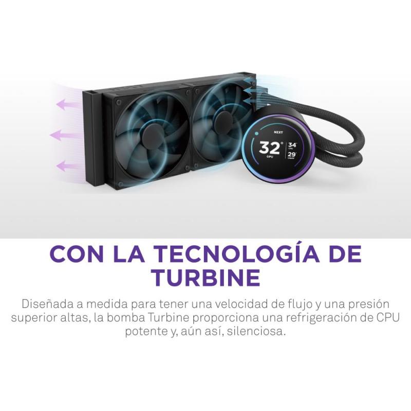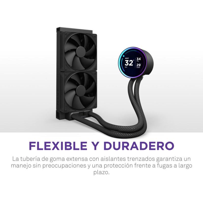 El refrigeración líquida NZXT Kraken Elite 240 es una solución avanzada de refrigeración líquida 240mm diseñada para mantener temperaturas óptimas en procesadores de alto rendimiento. Compatible con sockets Intel y AMD, este sistema ofrece una disipación eficiente del calor gracias a su radiador de aluminio y sus dos ventiladores de 120 mm. Con un máximo de 73,47 CFM de flujo de aire y una presión de hasta 4,5 mmH2O, garantiza un enfriamiento estable incluso en cargas exigentes. Además, incorpora una pantalla LCD 69mm personalizable, permitiendo visualizar información en tiempo real sobre la temperatura y el rendimiento del sistema. Su bomba de 2800 RPM y su tecnología de rodamiento dinámico fluido aseguran una operación silenciosa y una vida útil prolongada. Con un diseño elegante en color negro y tubos de caucho de 40 cm de longitud, este sistema de refrigeración no solo mejora el rendimiento, sino que también añade un toque estético a cualquier configuración de PC.