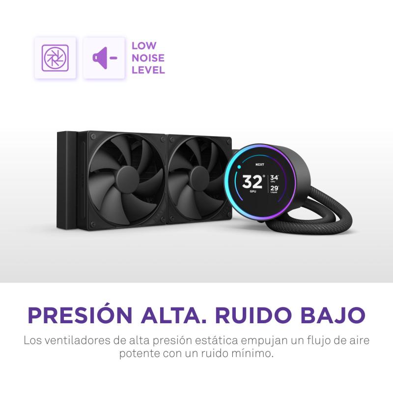REFRIGERACIÓN LÍQUIDA 240MM PARA RENDIMIENTO ÓPTIMO: El refrigeración líquida NZXT Kraken Elite 240 ofrece un sistema de refrigeración líquida 240mm que maximiza ladisipación del calor en procesadores de alto rendimiento. Con un radiador de aluminio y dos ventiladores de 120 mm, proporciona un flujo de aire de 73,47 CFM y una presión de hasta 4,5 mmH2O. Su bomba de 2800 RPM y el rodamiento dinámico fluido garantizan un funcionamiento eficiente y silencioso, ideal para configuraciones exigentes.
