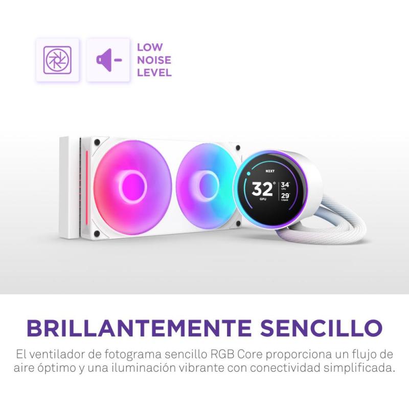 ILUMINACIÓN RGB PERSONALIZABLE PARA UN DISEÑO IMPACTANTE: El refrigeración líquida NZXT Kraken Elite 240 RGB no solo ofrece un rendimiento térmico superior, sino también una estética impresionante. Con su iluminación LED multicolor y ocho puntos de luz, proporciona una apariencia moderna y personalizable. Su compatibilidad con software de control RGB permite sincronizar efectos con otros componentes, creando una configuración visualmente atractiva y única.