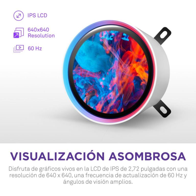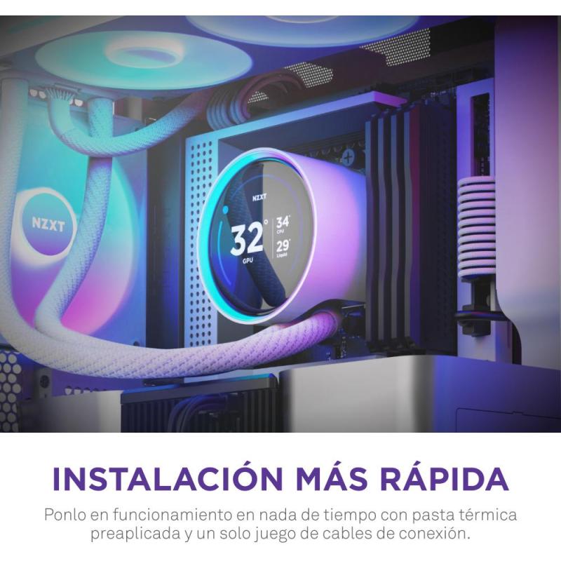 PANTALLA LCD PERSONALIZABLE PARA UN TOQUE ÚNICO: El refrigeración líquida NZXT Kraken Elite 360 RGB con refrigeración líquida 360 mm no solo optimiza la temperatura de tu equipo, sino que también ofrece un diseño innovador con su pantalla LCD personalizable. Con un tamaño de 69 x 69 mm, esta pantalla te permite mostrar información en tiempo real, como temperaturas y velocidades, o incluso personalizarla con imágenes y animaciones. Dale un toque exclusivo a tu PC con esta funcionalidad avanzada.
