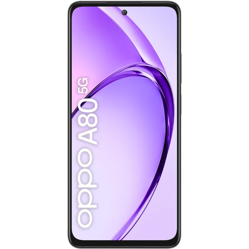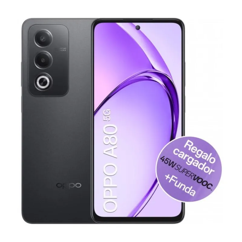 OPPO A80 5G: Diagonal de la pantalla: 16,9 cm (6.67"), Resolución de la pantalla: 1604 x 720 Pixeles. Frecuencia del procesador: 2,4 GHz, Familia de procesador: MediaTek Dimensity, Modelo del procesador: 6300. Capacidad de RAM: 8 GB, Tipo de RAM: LPDDR4X, Capacidad de almacenamiento interno: 256 GB. Resolución de la cámara trasera (numérica): 50 MP, Tipo de cámara trasera: Cámara doble. Capacidad de la tarjeta SIM: SIM doble. Sistema operativo instalado: Android 14. Capacidad de batería: 5100 mAh. Color del producto: Negro. Peso: 186 g