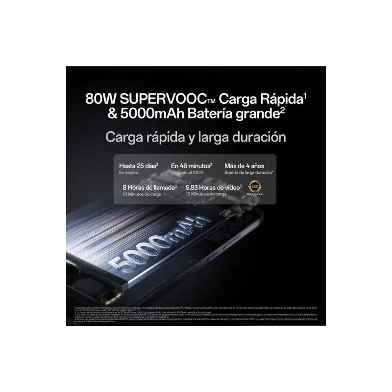 RENDIMIENTO SUPERIOR: La batería de litio de 5000 mAh, junto con la tecnología de carga rápida SuperVOOC, asegura que el dispositivo esté siempre listo para el uso intensivo. Con características adicionales como lector de huella digital, reconocimiento facial, altavoz integrado y comandos de voz, la experiencia de uso es cómoda y segura. Las videollamadas son fluidas gracias a la alta calidad de transmisión de audio y video.