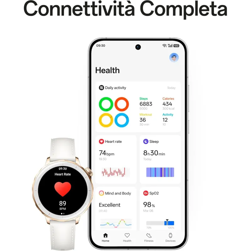 En su interior, el Smartwatch OPPO Watch X2 Mini Glimmer Gold destaca por su procesador Snapdragon W5 Gen 1, que garantiza un rendimiento rápido y eficiente. Con 2 GB de RAM y 32 GB de almacenamiento interno, podrás instalar aplicaciones sin preocuparte por el espacio. Está equipado con sensores avanzados como monitor óptico de frecuencia cardíaca, sensor de oxígeno en sangre, sensor de temperatura de la piel y barómetro. También incluye acelerómetro, giroscopio y sensor geomagnético para un seguimiento preciso de la actividad física. Su batería de 354 mAh ofrece hasta 60 horas de autonomía y hasta 168 horas en modo ahorro. Además, cuenta con conectividad eSIM, Bluetooth 5.2, Wi-Fi y NFC, asegurando una conectividad completa en todo momento.