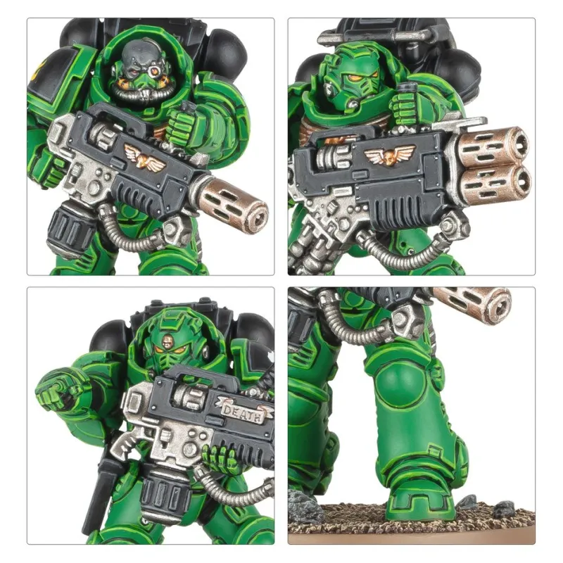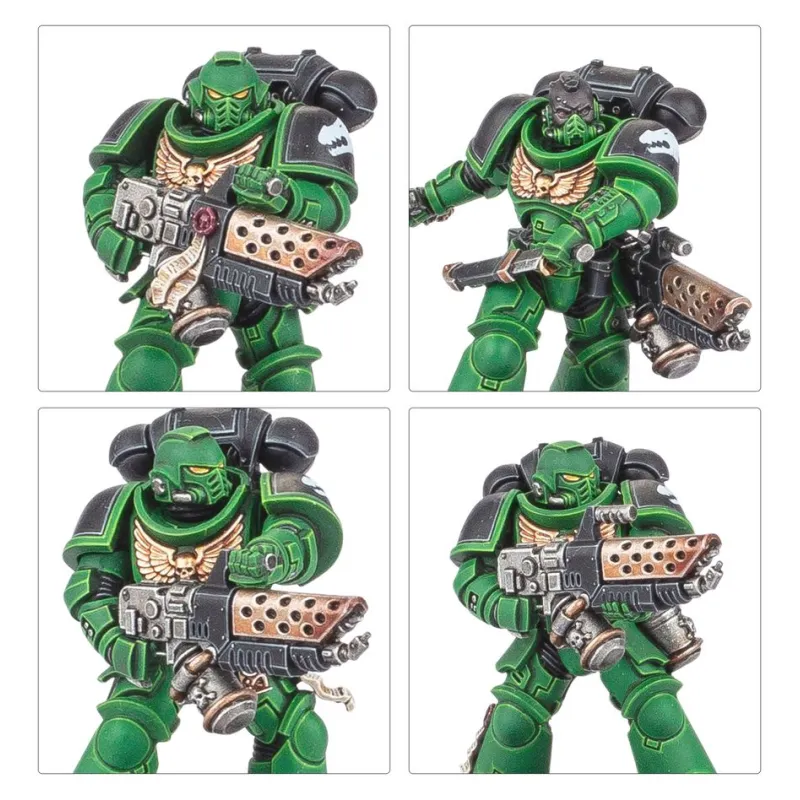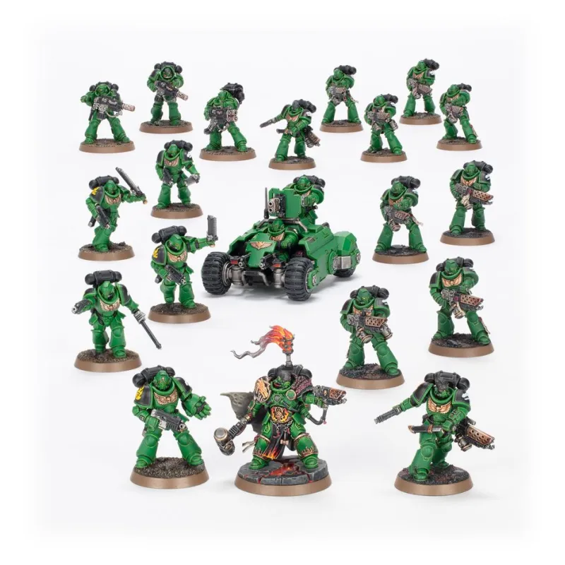 Patrulla: Salamanders con 20 miniaturas de Warhammer 40.000, incluye Adrax Agatone, Erradicadores, Marines Infernus y Quad Invader de Games Workshop.