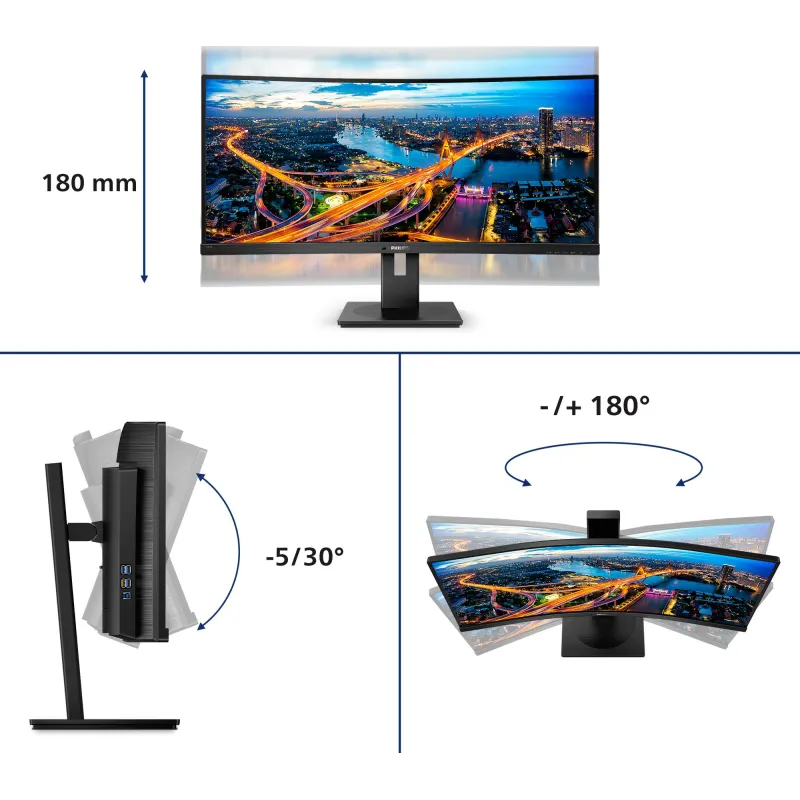 El Monitor Philips B Line 346B1C/00 ha sido diseñado pensando en la comodidad del usuario. Su soporte ergonómico permite ajustes de altura de hasta 18 cm, inclinación de -5° a 30° y giro de -180° a 180°, lo que facilita encontrar la posición ideal para cada usuario. También es compatible con montaje VESA, lo que amplía sus posibilidades de instalación. Además, su tecnología Low Blue Light y Flicker-Free reduce la fatiga ocular, permitiendo trabajar durante más tiempo sin molestias. La inclusión de un sensor de luz ambiental ajusta automáticamente el brillo de la pantalla, optimizando el consumo energético y mejorando la experiencia visual. Estas características hacen del Monitor Philips B line 345B1C/00 una opción ideal para jornadas laborales intensas o sesiones de entretenimiento prolongadas.
