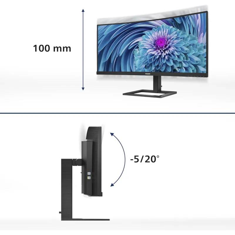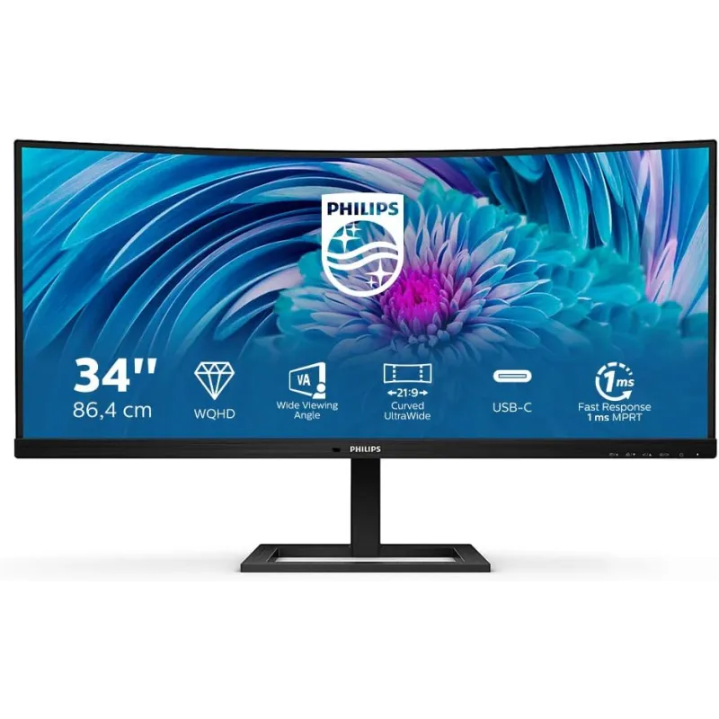Monitor Philips E line 346E2CUAE/00 con pantalla curva 34 pulgadas, resolución WQHD y frecuencia de actualización 100 Hz para mayor fluidez