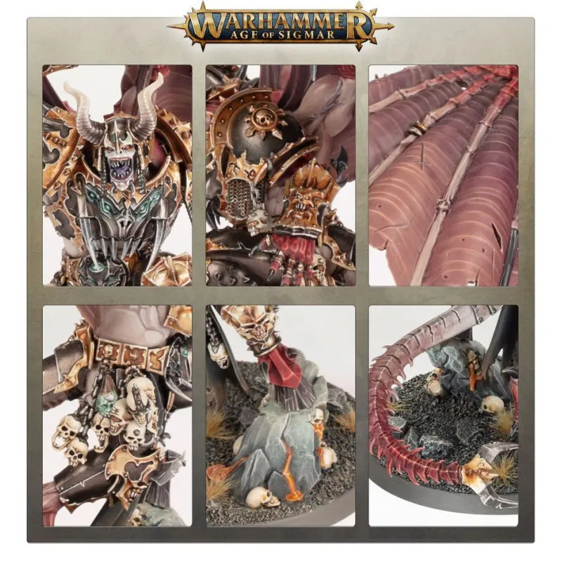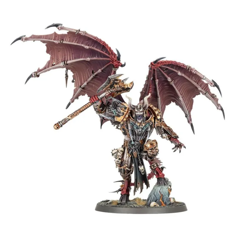 Beneficios clave: miniatura de personaje del Caos, kit plástico multicomponente, opciones de armamento, varias configuraciones estéticas, peana grande de monstruo, presencia escénica destacada, compatible con Age of Sigmar, compatible con Warhammer 40.000, ideal como líder de ejército, alto nivel de detalle, pieza central de colección, buena superficie para técnicas de pintura avanzadas