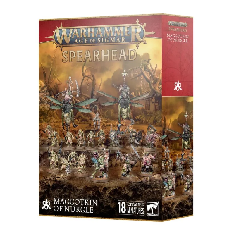 Si te atrae el estilo enfermizo y resistente de Nurgle en Age of Sigmar, esta Punta de lanza: Maggotkin de Nurgle te da en una sola caja una fuerza compacta con héroes y tropas corruptas lista para desplegar en partidas Spearhead, ideal para jugadores que empiezan o veteranos que quieren un destacamento temático para campañas.