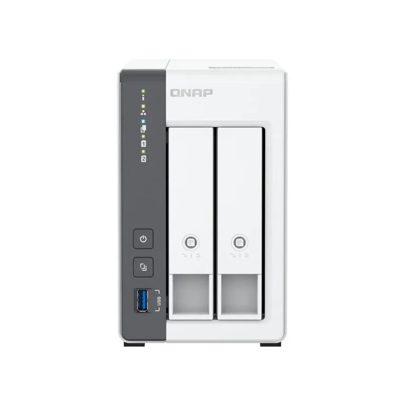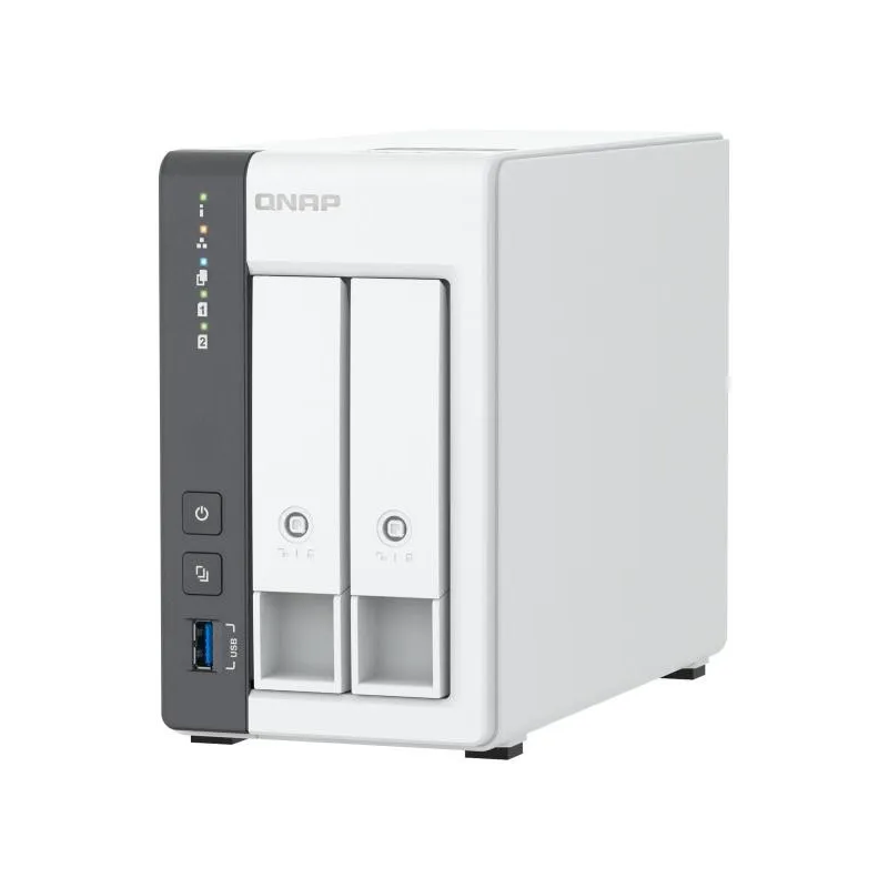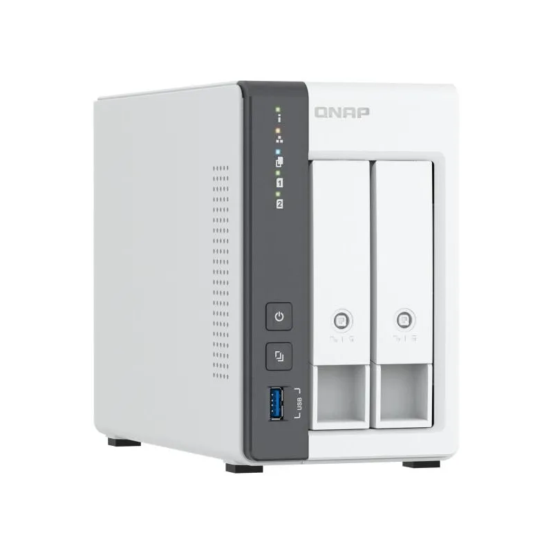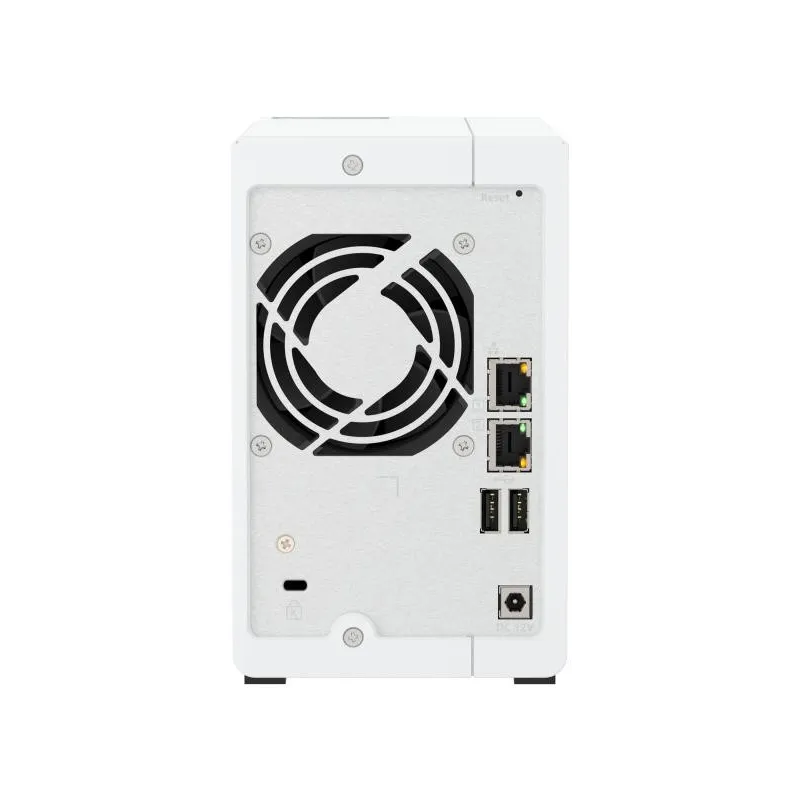 En términos de conectividad, este NAS incluye Ethernet LAN con velocidades de transferencia de datos de hasta 2500 Mbit/s y soporte para Jumbo Frames. Además, cuenta con puertos USB (2 x USB 2.0 y 1 x USB 3.2 Gen 1) y dos puertos Ethernet LAN (RJ-45), permitiendo hasta 200 conexiones concurrentes. El chasis tipo torre en color blanco presenta un diseño de enfriamiento activo con un ventilador de 7 cm y múltiples indicadores LED para un fácil monitoreo del estado del dispositivo.