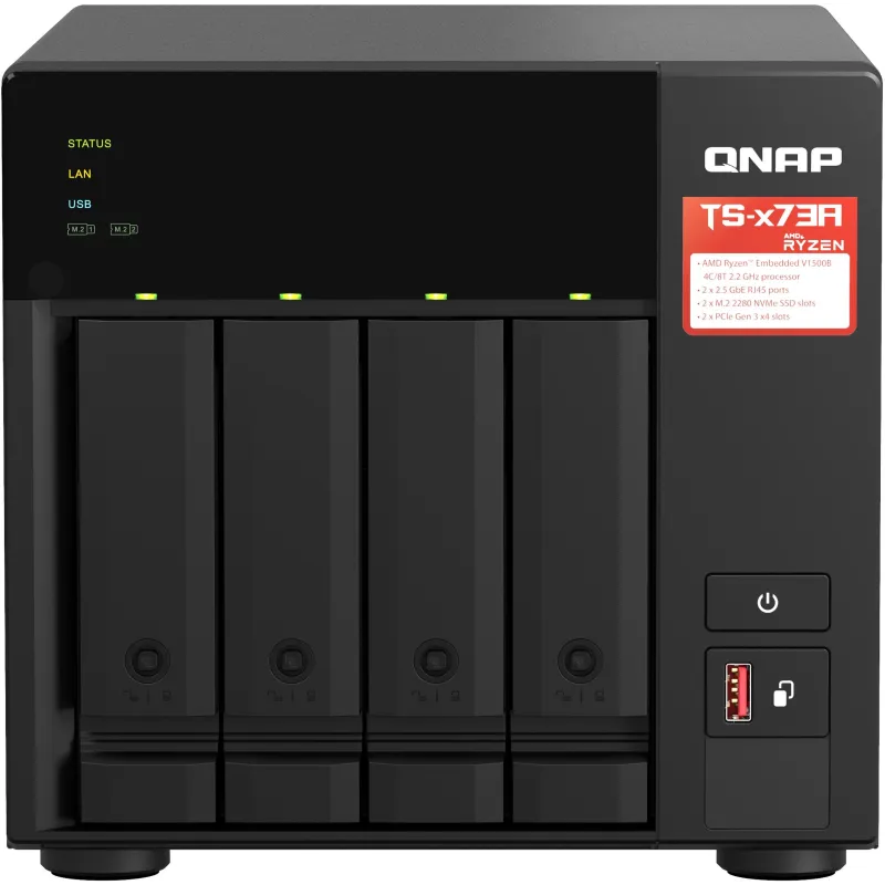 PROCESADOR AMD RYZEN™ DE ALTO RENDIMIENTO: El TS-473A está equipado con un procesador AMD Ryzen™ V1000 serie V1500 de cuatro núcleos a 2,2 GHz con hasta 64 GB de RAM (se admite memoria ECC*) y cuenta con puertos USB 3.2 Gen 2 para velocidades de hasta 10 GB/s. El TS-473A también proporciona un puerto USB tipo C para admitir más dispositivos para transferir archivos multimedia grandes entre dispositivos, lo que le brinda un flujo de trabajo más eficiente.