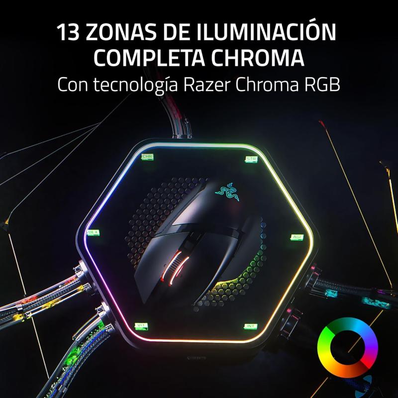 ILUMINACIÓN CHROMA DE 13 ZONAS CON RESPLANDOR COMPLETO: Impulsado por Razer Chroma™ RGB. Personaliza cada zona con más de 16.8 millones de colores y numerosos efectos de iluminación, y experimenta una mayor inmersión a medida que reaccionan dinámicamente con cientos de juegos integrados en Chroma.