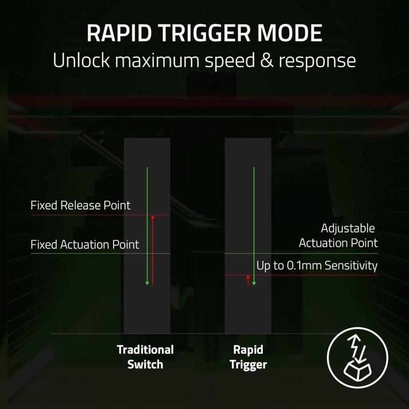 MODO DE DISPARO RÁPIDO: Libera y presiona repetidamente las teclas a una velocidad mucho más rápida de lo que es físicamente posible en teclados estándar. Con la capacidad de restablecer las teclas con el más mínimo levantamiento de un dedo, experimenta una ventaja en velocidad que es especialmente útil para el movimiento en juegos de primera y tercera persona.