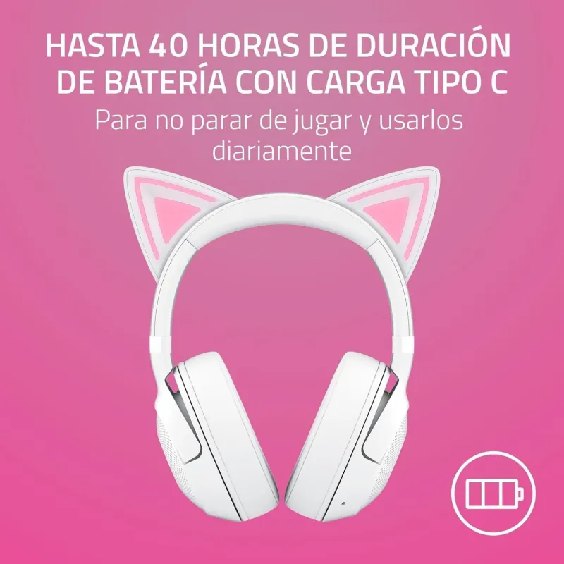 40 HORAS DE AUTONOMÍA PARA SESIONES EXTENSAS DE JUEGO: Una de las mayores ventajas de los Auriculares Razer Kraken Kitty V2 BT es su batería integrada de larga duración que ofrece hasta 40 horas de reproducción continua. Esta autonomía permite disfrutar de múltiples sesiones de juego, trabajo o entretenimiento sin preocuparse por la carga. La batería se recarga cómodamente mediante USB, asegurando un proceso rápido y eficiente. Esta duración, combinada con la versión de Bluetooth 5.2, garantiza un rendimiento sostenido sin interrupciones. Los Auriculares Razer Kraken Kitty V2 BT están diseñados para quienes buscan fiabilidad y rendimiento en un formato inalámbrico. Ya sea para gaming intenso o uso diario, su batería de alto rendimiento los convierte en una opción ideal para usuarios exigentes.