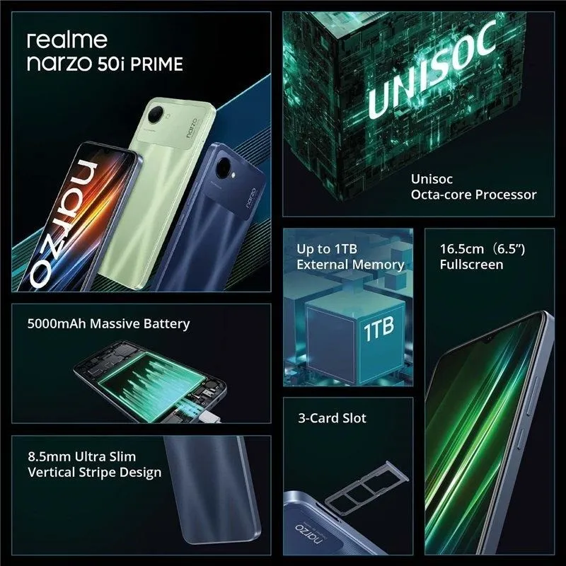 RANURA PARA 3 TARJETAS: Memoria externa de hasta 1 TB. realme narzo 50i Prime tiene una ranura para 3 tarjetas y una memoria externa de hasta 1 TB para permitirte la máxima versatilidad. Esto significa que dispondrás de más opciones que nunca: más SIMs para múltiples usos, más espacio de almacenamiento para tus fotos y videos favoritos, y más juegos y descargas sin tener que preocuparte.