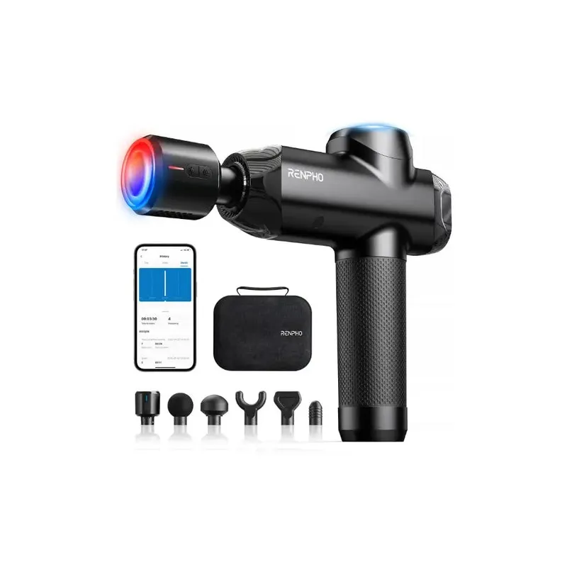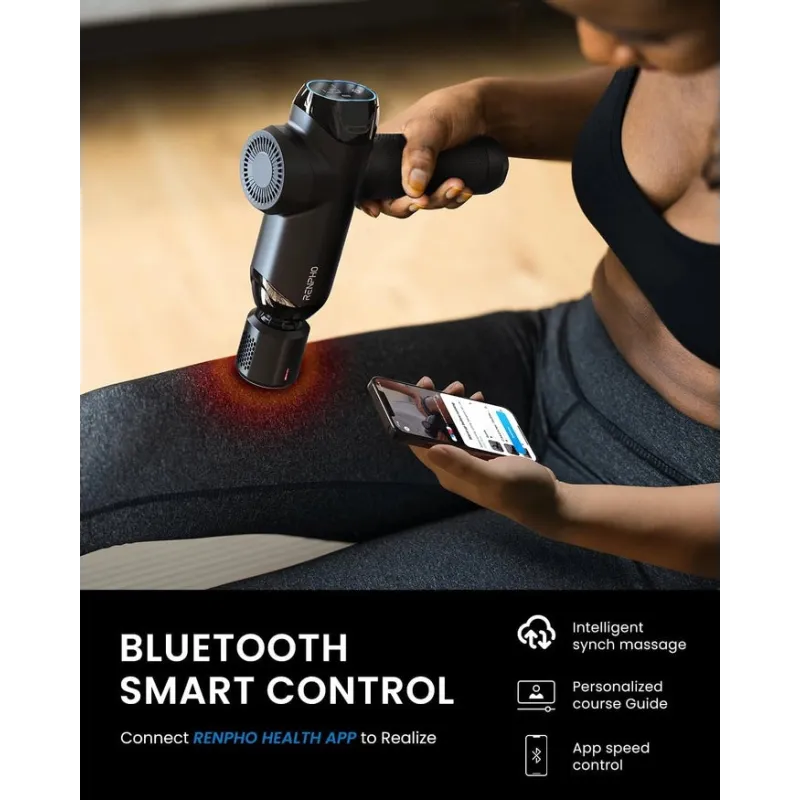 Combina 6 cabezales, 6 velocidades y 12 mm de amplitud para trabajar tejido profundo con precisión. La conectividad Bluetooth (BLE) permite controlar intensidades y rutinas desde la app Renpho, facilitando sesiones guiadas.
