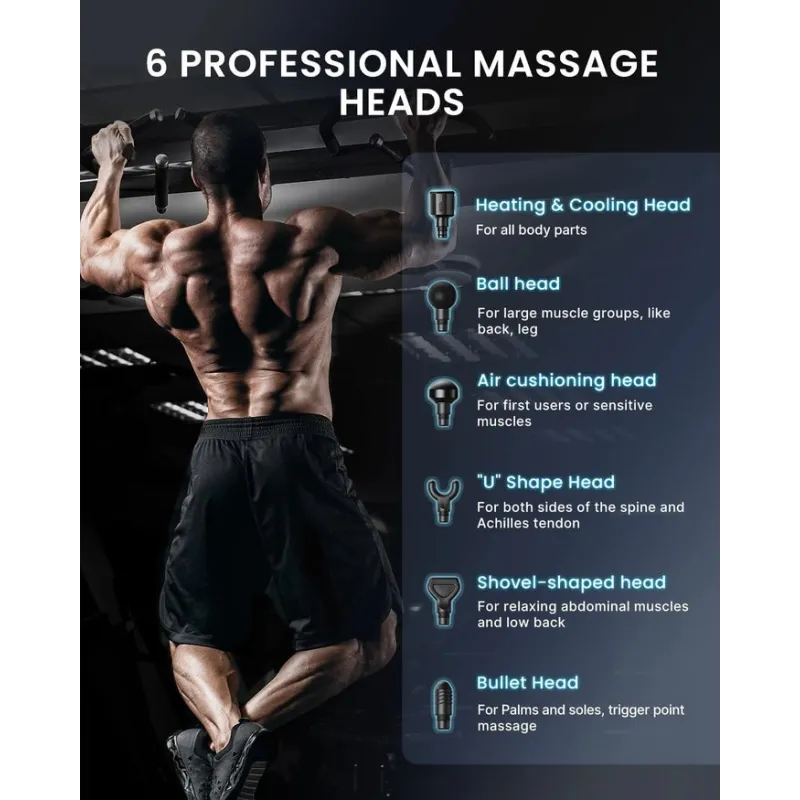 Incluye 6 cabezales intercambiables para diferentes grupos musculares y usos.