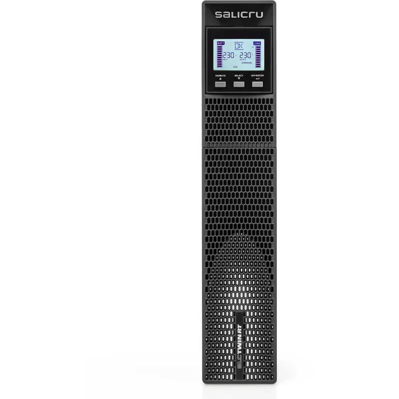 La gama de Sistemas de Alimentación Ininterrumpida (SAI/UPS) SLC TWIN RT2 de Salicru es una muy avanzada solución de continuidad en la protección eléctrica de sistemas críticos. Aúna la tecnología de doble conversión (AC/DC-DC/AC), la más fiable del mercado, con un factor de potencia de salida unitario (VA=W), para alimentar sistemas con altos requerimientos energéticos ofreciendo, al mismo tiempo, una alta eficiencia de funcionamiento. La gama de potencias que cubre desde los 700 VA(W) hasta los 3.000 VA(W), se presenta en formato rack de 2U, convertible a formato torre, con la pantalla LCD orientable, según necesidades de la instalación. Asimismo, dispone de soluciones con cargador extra y módulos adicionales de baterías para aquellas aplicaciones que requieran de mayor back-up de respaldo. En cuanto a las comunicaciones, dispone de interface RS-232/USB compatible con protocolo HID y de un slot inteligente que puede alojar, opcionalmente, una tarjeta SNMP, MODBUS o contactos libres de potencial; también están disponibles paquetes de software para la monitorización y gestión, local o virtual, de los equipos protegidos. Y como otras características destacables podemos citar: convertidor de frecuencia 50/60 o 60/50 Hz, paro de emergencia (EPO), y salidas programables para cargas críticas/no críticas.