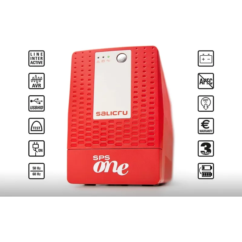 SPS ONE A UL: LA MEJOR PROTECCIÓN ELÉCTRICA PARA LA OFIMÁTICA DOMÉSTICA Y PROFESIONAL: Sistema de Alimentación Ininterrumpida (SAI/UPS) de formato minitorre con topología Line-interactive, la serie SPS ONE A UL de Salicru proporciona back-up de batería (con salida de ondulador pseudosenoidal) y protección contra sobrecargas. Durante los cortes de tensión, los equipos SPS ONE A UL entregan respaldo de batería para realizar un apagado correcto del sistema informático y proteger contra la pérdida de datos y daños a la electrónica. Funcionamiento mediante regulación automática de tensión (AVR) para corregir pequeñas fluctuaciones de tensión sin tener que utilizar la batería, alargando la vida útil de ésta. La función AVR es esencial en áreas donde las fluctuaciones de tensión ocurren con frencuencia. Incorpora interface de comunicación SAI/PC del tipo USB con protocolo HID, lo que le permite la configuración de parámetros, control del SAI y cierre o hibernación del ordenador a través del puerto USB. Compatible con sistemas operativos Windows, Linux y Mac. También disponible software de gestión y monitorización del SAI para cierre de ficheros/aplicaciones para familia Windows, Linux y Mac; gratuito y descargable desde www.salicru.com.