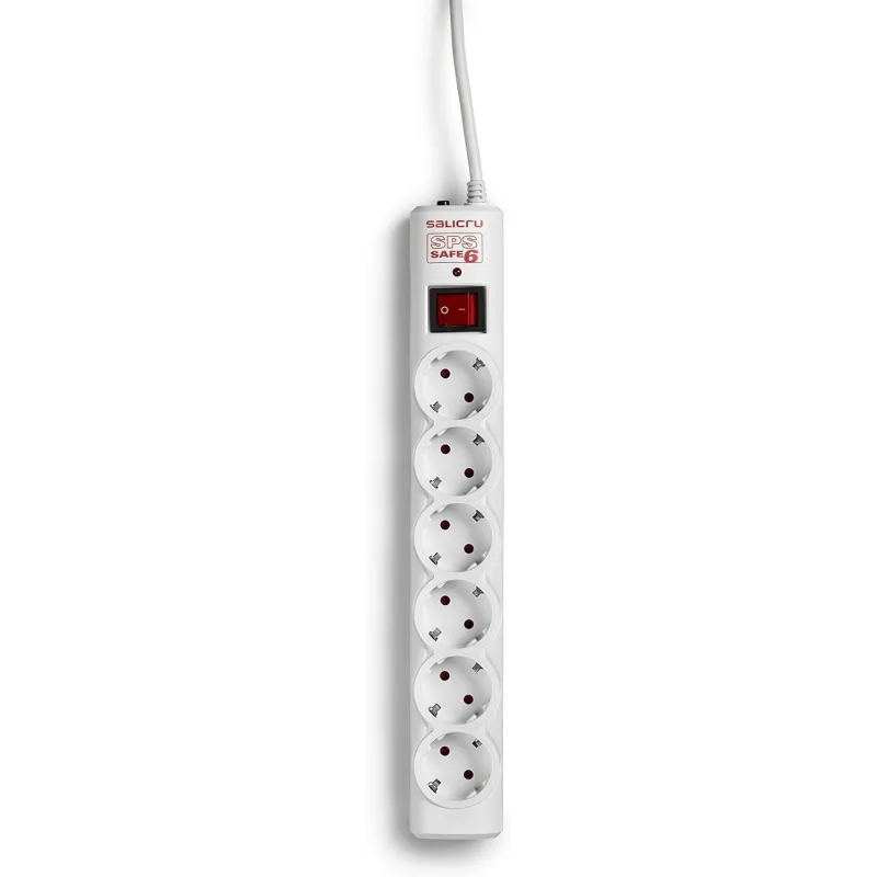 Regleta protección sobretensiones Salicru SPS SAFE 6S. Esta regleta con protección integra 6 tomas para distribuir energía de forma segura en sobremesa o bajo escritorio. Su misión es proteger tus equipos frente a picos y sobretensiones habituales en redes domésticas y de oficina, algo crítico cuando conectas PC, monitor, consola, router o TV. Incluye interruptor general con indicador luminoso para cortar el suministro de una sola vez y evitar consumos fantasma, además de tomas con toma de tierra para una conexión fiable.
