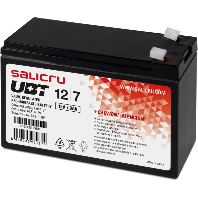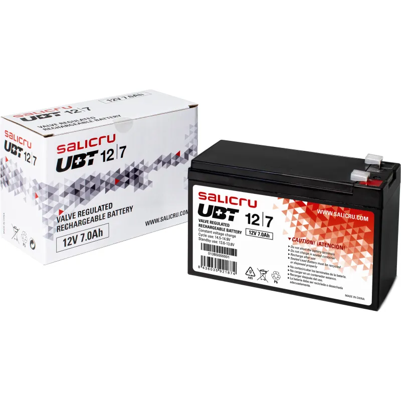 Las baterías de la serie UBT de Salicru son acumuladores de energía altamente potentes y compactos, basados en sistemas recargables de plomo-dióxido de plomo, y son especialmente óptimos para las aplicaciones de Sistemas de Alimentación Ininterrumpida SAI/UPS y otros sistemas de seguridad que requieren de un back-up de energía fiable y de calidad. La gama de baterías UBT de Salicru incluye los modelos de 4,5 Ah, 7 Ah, 9 Ah, 12 Ah y 17 Ah, todos a 12 V. El electrolito de ácido sulfúrico se encuentra absorbido por los separadores y placas. Y éstas a su vez inmovilizadas. Están diseñados utilizando la tecnología de recombinación de gas que elimina la necesidad para la adición regular de agua mediante el control de la evolución de hidrógeno y oxígeno durante la carga. La batería está completamente sellada y hermética y por lo tanto es libre de mantenimiento, permitiendo ser utilizada en cualquier posición. En el caso que accidentalmente la batería sea sobrecargada produciendo hidrógeno y oxígeno, unas válvulas especiales unidireccionales permiten que los gases salgan al exterior evitando la sobrepresión en su interior.