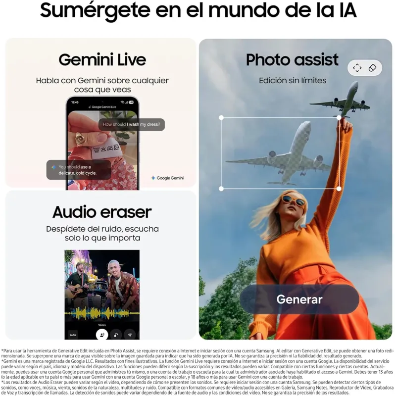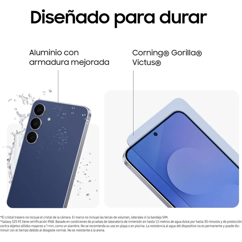 El Smartphone Samsung Galaxy S25 FE 8GB/256GB Azul Marino también destaca en el apartado fotográfico con una cámara trasera triple de hasta 50 MP, zoom óptico 3x y estabilización óptica de imagen. La cámara frontal de 12 MP permite selfies nítidas y videollamadas de alta calidad. Con una batería de 4900 mAh y carga rápida de hasta 45 W, podrás disfrutar de hasta 28 horas de reproducción de vídeo. Su diseño elegante en color Marina, resistente al agua y al polvo con certificación IP68, se complementa con un cuerpo de aluminio ligero y resistente. Este modelo incluye pantalla Dynamic AMOLED 2X y un procesador Exynos 2400 que lo convierten en una opción ideal para quienes buscan rendimiento y estilo en un solo dispositivo.