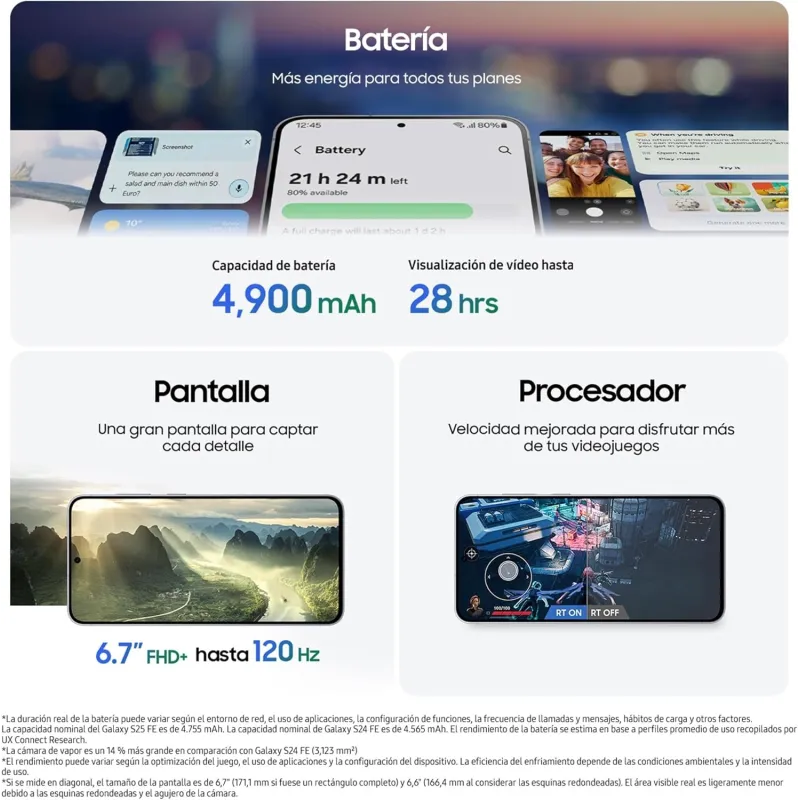 La batería de 4900 mAh del Smartphone Samsung Galaxy S25 FE 8GB/256GB Azul Marino proporciona hasta 28 horas de reproducción de vídeo, permitiendo un uso prolongado sin necesidad de recargas frecuentes. Además, la carga rápida de hasta 45 W permite recuperar energía en pocos minutos. La eficiencia energética del procesador Exynos 2400 y la tecnología de pantalla optimizada contribuyen a una mejor gestión del consumo energético. Esto se traduce en una mayor autonomía y una experiencia más fluida durante todo el día. Ya sea para trabajar, jugar o ver contenido multimedia, este dispositivo está preparado para acompañarte sin interrupciones, con la garantía de rendimiento y durabilidad que ofrece Samsung.