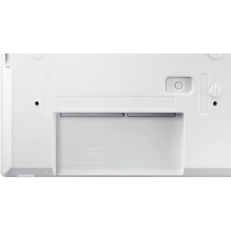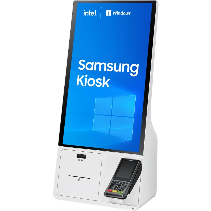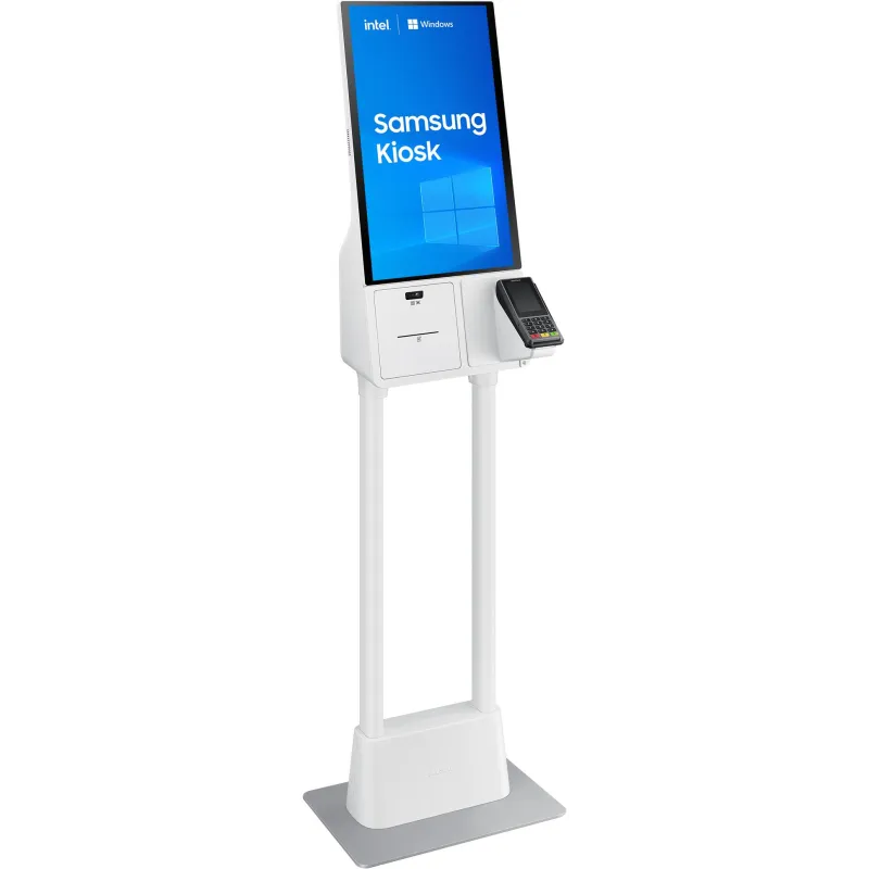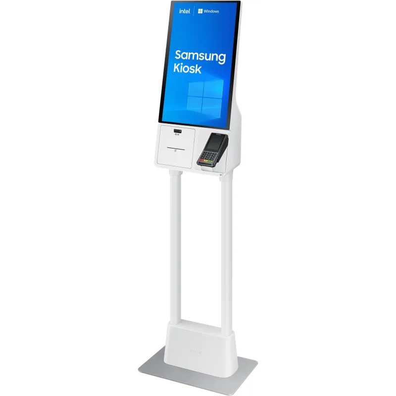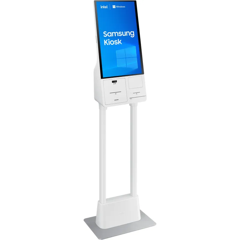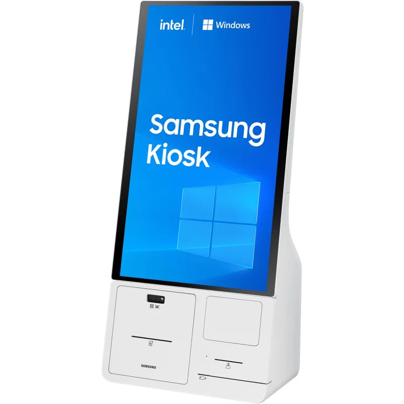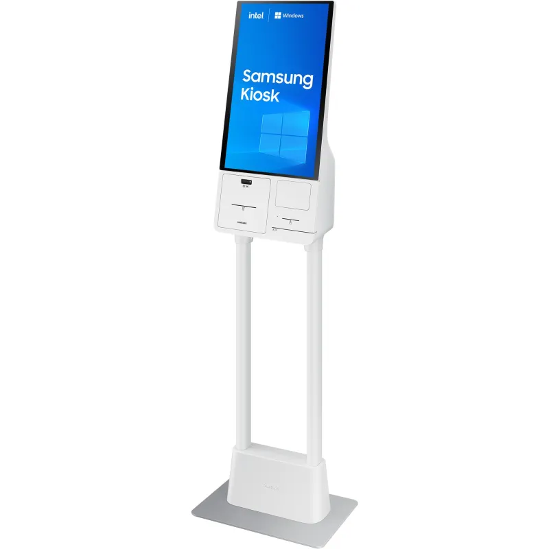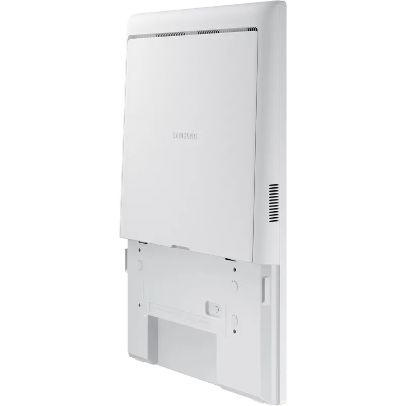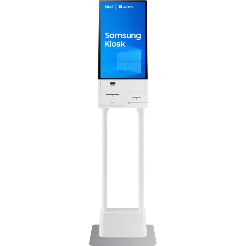 Pantalla interactiva Samsung KM24C-3  de 24": resolución Full HD 1920 x 1080, LED 250 cd/m², táctil, Windows 10 IoT Enterprise, diseño de quiosco blanco.