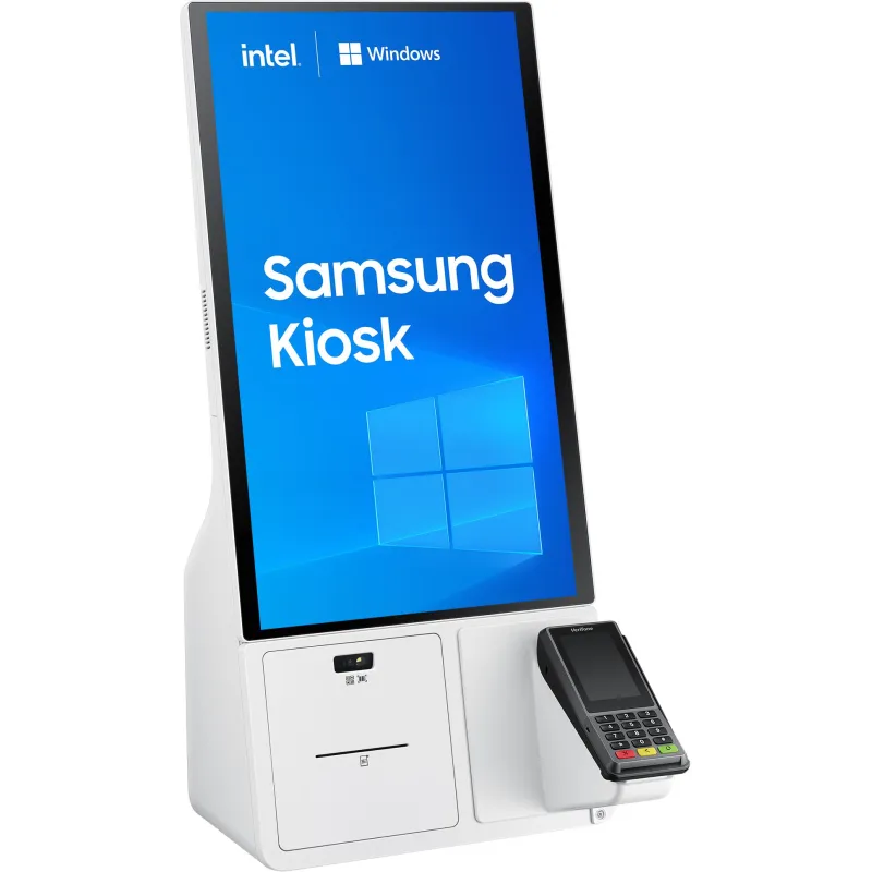El diseño de quiosco y la compatibilidad comercial orientan su instalación a puntos de atención y autoservicio.