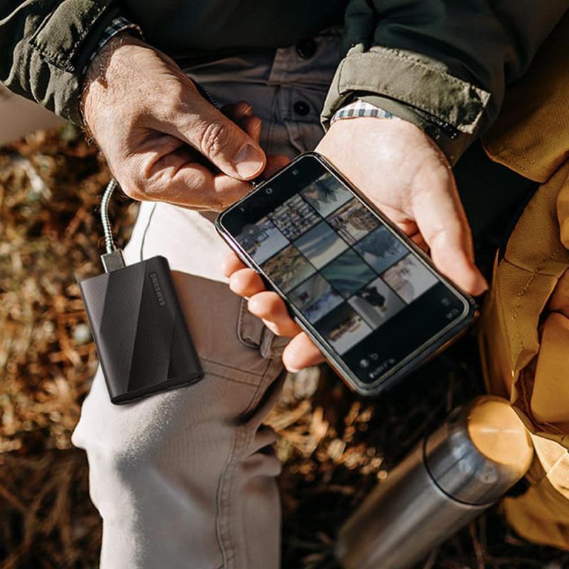 PERFECTO PARA LLEVAR CONTIGO: T9 está disponible en versiones de 1TB, 2TB y 4TB para ofrecerte mucho espacio de almacenamiento en un formato compacto y ligero de solo 122 g de peso. Gracias a su acabado rugoso y antideslizante, puedes llevarlo en la mano con total seguridad y comodidad.