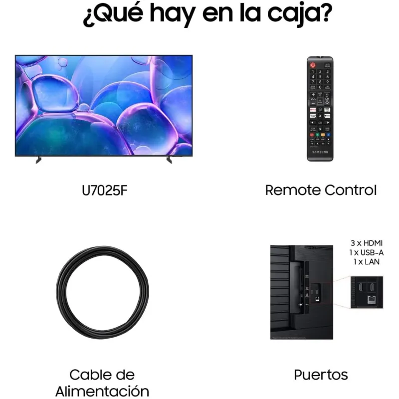 El Televisor Samsung TU75U7025FK incorpora funciones inteligentes como Smart TV con sistema operativo Tizen, compatible con Apple AirPlay 2, Amazon Alexa, Google Assistant y Samsung Bixby. Su interfaz intuitiva permite acceder fácilmente a plataformas de streaming y aplicaciones mediante la guía universal y el navegador web. El procesador Crystal 4K optimiza el rendimiento en videojuegos con funciones como modo automático de baja latencia, VRR y Gaming Hub. En sonido, destaca el sistema Object Tracking Sound Lite y Q-Symphony, que mejoran la inmersión auditiva. Con un diseño sin bisel y soporte de patas, su estética moderna se adapta a cualquier salón. Además, incorpora modo ahorro de energía y AI Energy Mode para una mayor eficiencia. El Televisor Samsung TU75U7025FK es ideal para quienes buscan calidad de imagen, conectividad y funciones avanzadas en un solo dispositivo.