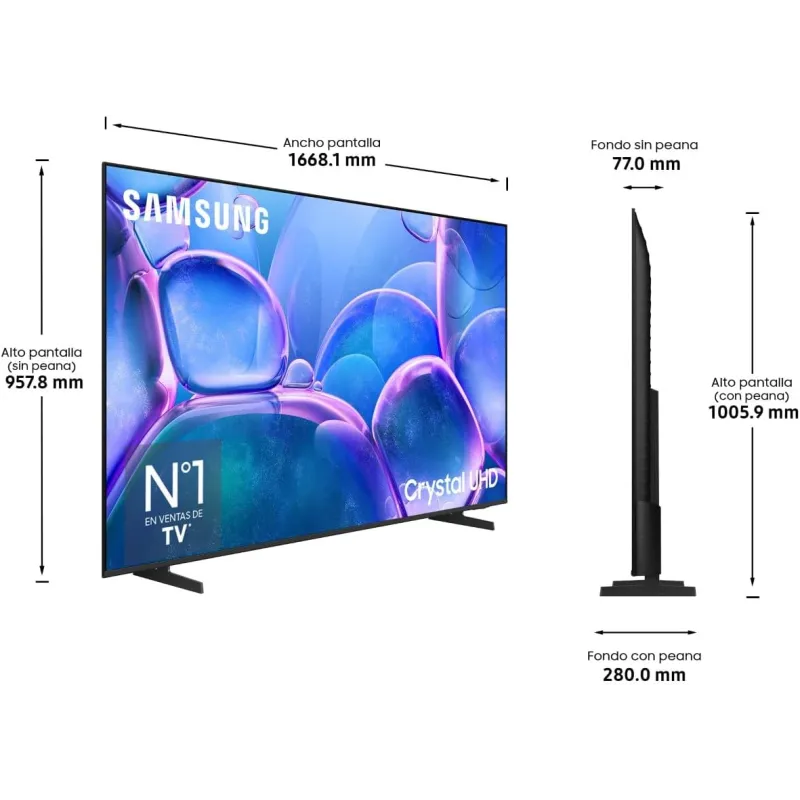 El Televisor Samsung TU75U7025FK destaca por su diseño elegante y funcional. Su estructura sin bisel y el soporte de patas le otorgan una estética moderna que se integra fácilmente en cualquier espacio. A pesar de su gran pantalla 4K Ultra HD, mantiene un perfil delgado y un peso equilibrado, lo que facilita su instalación en pared gracias a la compatibilidad con montaje VESA. Además, incorpora funciones de modo ahorro de energía y AI Energy Mode, que ajustan el consumo eléctrico en función del entorno. Con una eficiencia energética clasificada en clase G, el procesador Crystal 4K también contribuye a optimizar los recursos sin sacrificar rendimiento. Este modelo combina diseño, sostenibilidad y alto rendimiento en un solo dispositivo.